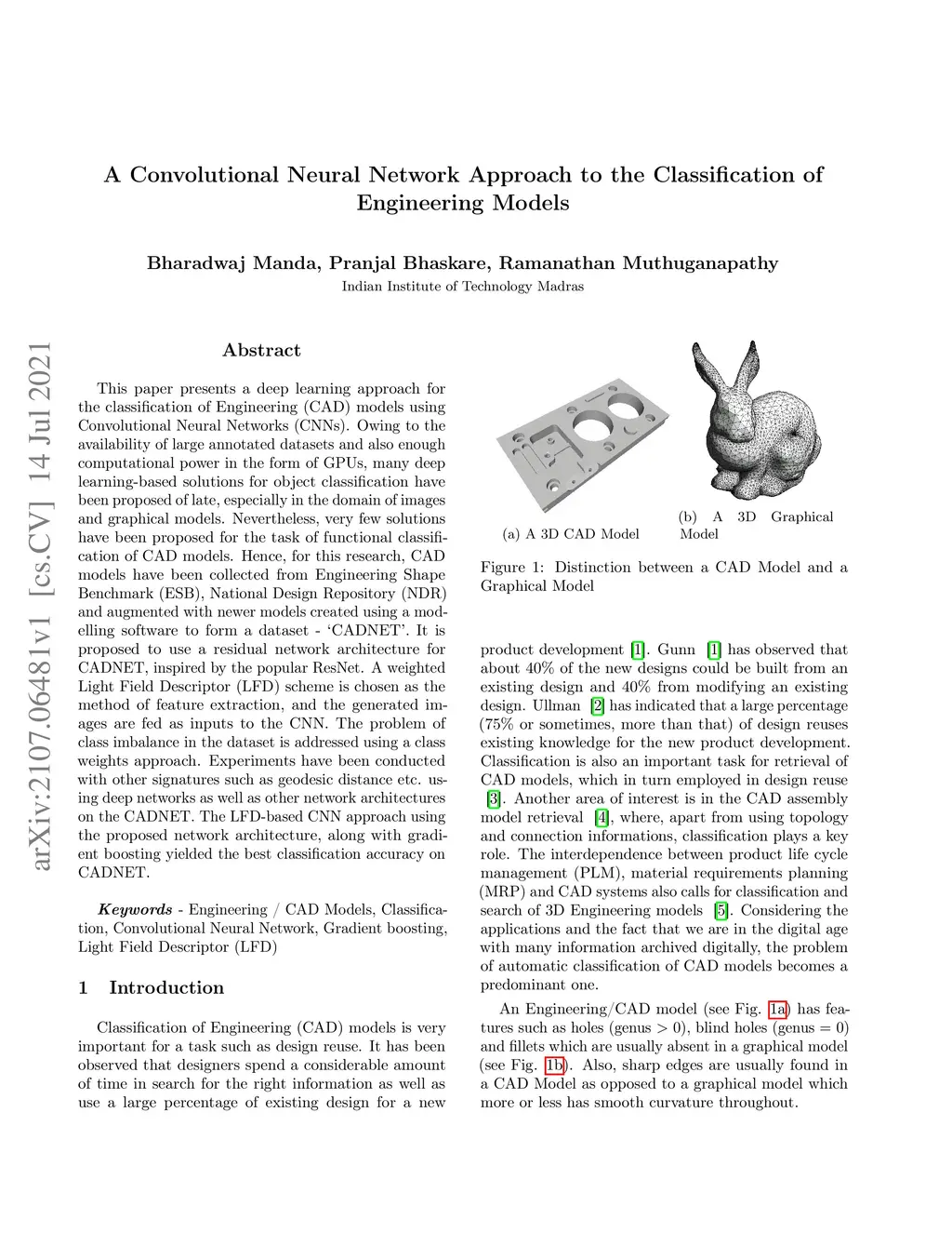 This paper presents a deep learning approach for the classification of Engineering (CAD) models using Convolutional Neural Networks (CNNs). Owing to the availability of large annotated datasets and also enough computational power in the form of GPUs, many deep learning-based solutions for object classification have been proposed of late, especially in the domain of images and graphical models. Nevertheless, very few solutions have been proposed for the task of functional classification of CAD models. Hence, for this research, CAD models have been collected from Engineering Shape Benchmark (ESB), National Design Repository (NDR) and augmented with newer models created using a modelling software to form a dataset - 'CADNET'. It is proposed to use a residual network architecture for CADNET, inspired by the popular ResNet. A weighted Light Field Descriptor (LFD) scheme is chosen as the method of feature extraction, and the generated images are fed as inputs to the CNN. The problem of class imbalance in the dataset is addressed using a class weights approach. Experiments have been conducted with other signatures such as geodesic distance etc. using deep networks as well as other network architectures on the CADNET. The LFD-based CNN approach using the proposed network architecture, along with gradient boosting yielded the best classification accuracy on CADNET.
