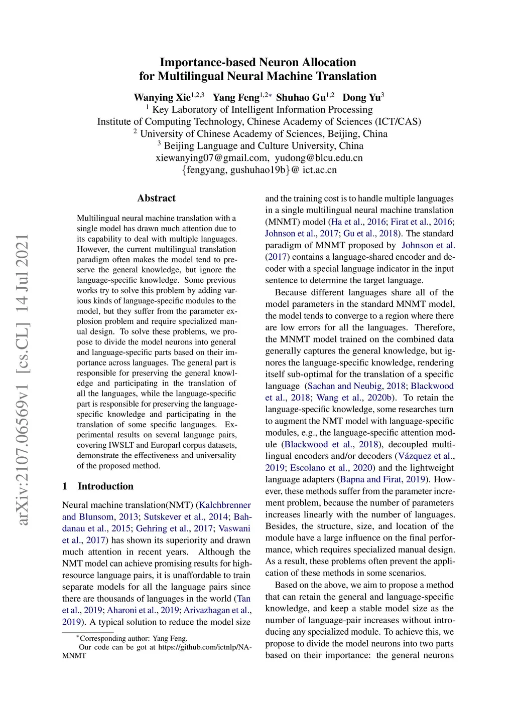 Importance-based Neuron Allocation for Multilingual Neural Machine