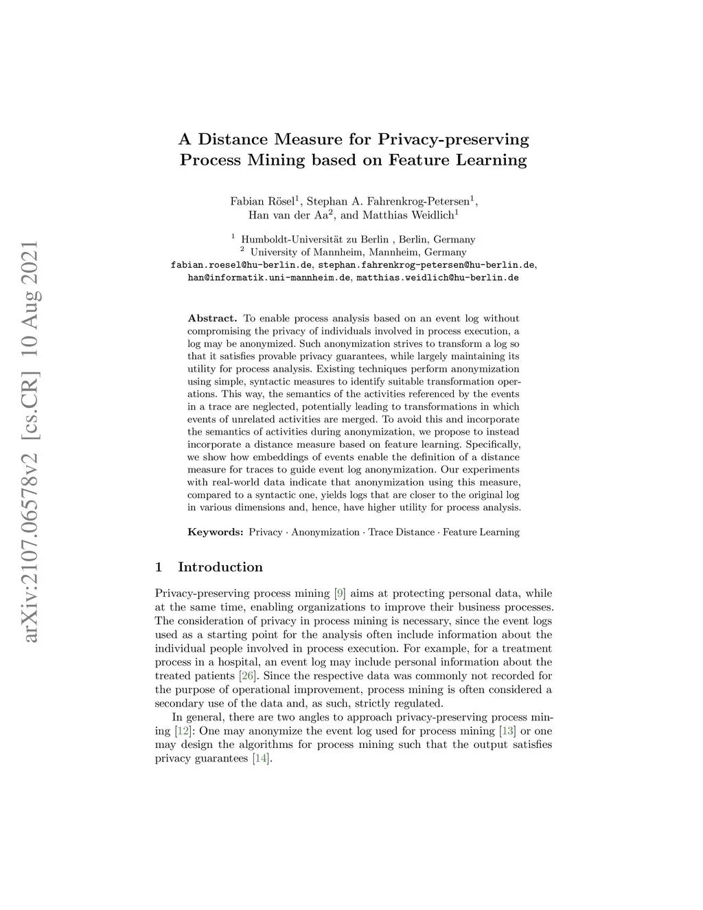 To enable process analysis based on an event log without compromising the privacy of individuals involved in process execution, a log may be anonymized. Such anonymization strives to transform a log so that it satisfies provable privacy guarantees, while largely maintaining its utility for process analysis. Existing techniques perform anonymization using simple, syntactic measures to identify suitable transformation operations. This way, the semantics of the activities referenced by the events in a trace are neglected, potentially leading to transformations in which events of unrelated activities are merged. To avoid this and incorporate the semantics of activities during anonymization, we propose to instead incorporate a distance measure based on feature learning. Specifically, we show how embeddings of events enable the definition of a distance measure for traces to guide event log anonymization. Our experiments with real-world data indicate that anonymization using this measure, compared to a syntactic one, yields logs that are closer to the original log in various dimensions and, hence, have higher utility for process analysis.