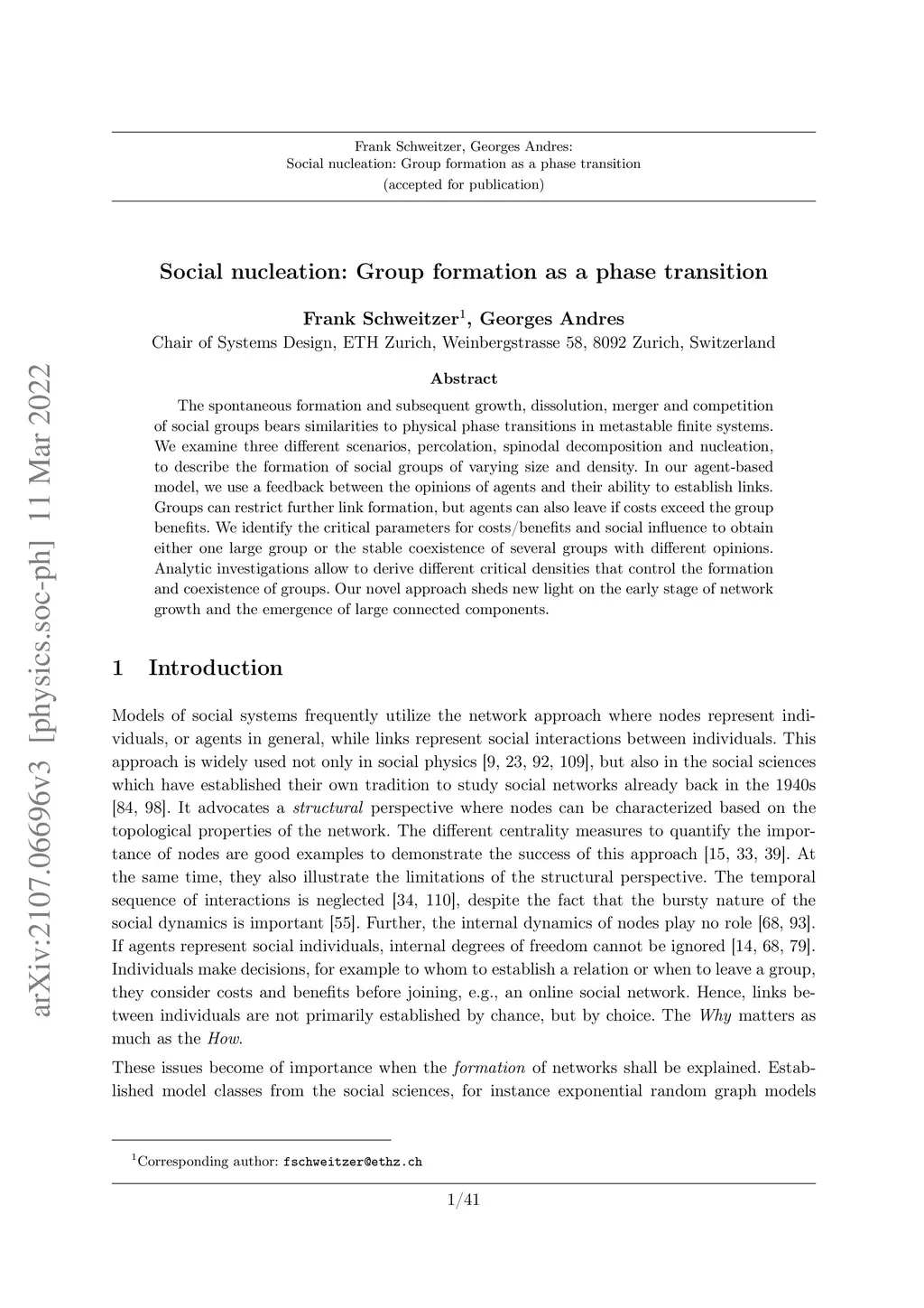 The spontaneous formation and subsequent growth, dissolution, merger and competition of social groups bears similarities to physical phase transitions in metastable finite systems. We examine three different scenarios, percolation, spinodal decomposition and nucleation, to describe the formation of social groups of varying size and density. In our agent-based model, we use a feedback between the opinions of agents and their ability to establish links. Groups can restrict further link formation, but agents can also leave if costs exceed the group benefits. We identify the critical parameters for costs/benefits and social influence to obtain either one large group or the stable coexistence of several groups with different opinions. Analytic investigations allow to derive different critical densities that control the formation and coexistence of groups. Our novel approach sheds new light on the early stage of network growth and the emergence of large connected components.