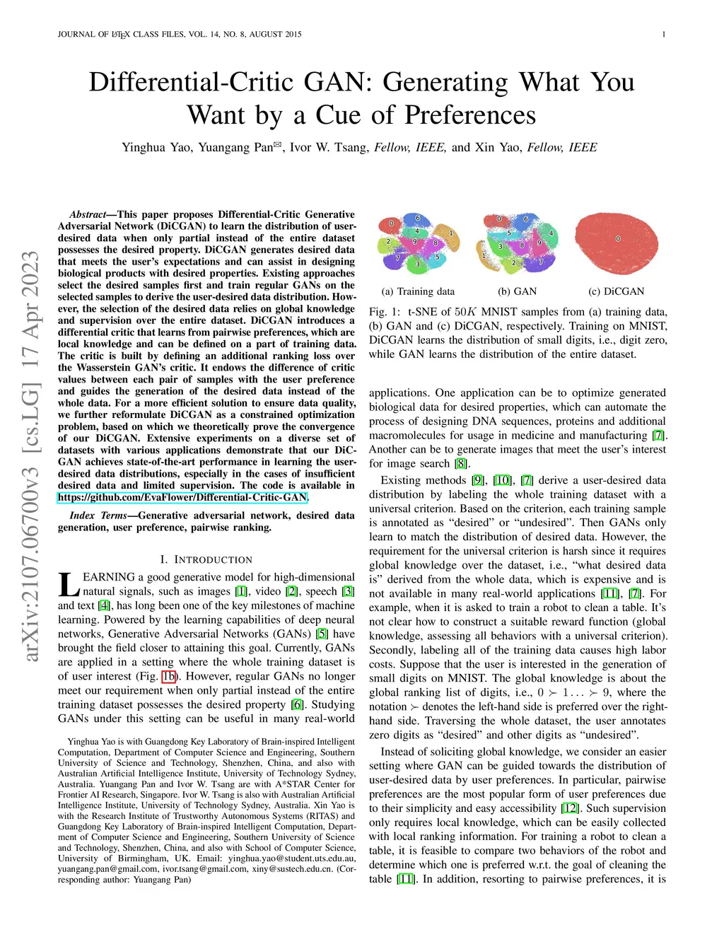 This paper proposes Differential-Critic Generative Adversarial Network (DiCGAN) to learn the distribution of user-desired data when only partial instead of the entire dataset possesses the desired property. DiCGAN generates desired data that meets the user's expectations and can assist in designing biological products with desired properties. Existing approaches select the desired samples first and train regular GANs on the selected samples to derive the user-desired data distribution. However, the selection of the desired data relies on global knowledge and supervision over the entire dataset. DiCGAN introduces a differential critic that learns from pairwise preferences, which are local knowledge and can be defined on a part of training data. The critic is built by defining an additional ranking loss over the Wasserstein GAN's critic. It endows the difference of critic values between each pair of samples with the user preference and guides the generation of the desired data instead of the whole data. For a more efficient solution to ensure data quality, we further reformulate DiCGAN as a constrained optimization problem, based on which we theoretically prove the convergence of our DiCGAN. Extensive experiments on a diverse set of datasets with various applications demonstrate that our DiCGAN achieves state-of-the-art performance in learning the user-desired data distributions, especially in the cases of insufficient desired data and limited supervision.