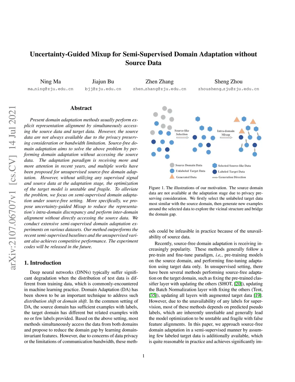 Present domain adaptation methods usually perform explicit representation alignment by simultaneously accessing the source data and target data. However, the source data are not always available due to the privacy preserving consideration or bandwidth limitation. Source-free domain adaptation aims to solve the above problem by performing domain adaptation without accessing the source data. The adaptation paradigm is receiving more and more attention in recent years, and multiple works have been proposed for unsupervised source-free domain adaptation. However, without utilizing any supervised signal and source data at the adaptation stage, the optimization of the target model is unstable and fragile. To alleviate the problem, we focus on semi-supervised domain adaptation under source-free setting. More specifically, we propose uncertainty-guided Mixup to reduce the representation's intra-domain discrepancy and perform inter-domain alignment without directly accessing the source data. Finally, we conduct extensive semi-supervised domain adaptation experiments on various datasets. Our method outperforms the recent semi-supervised baselines and the unsupervised variant also achieves competitive performance. The experiment codes will be released in the future.