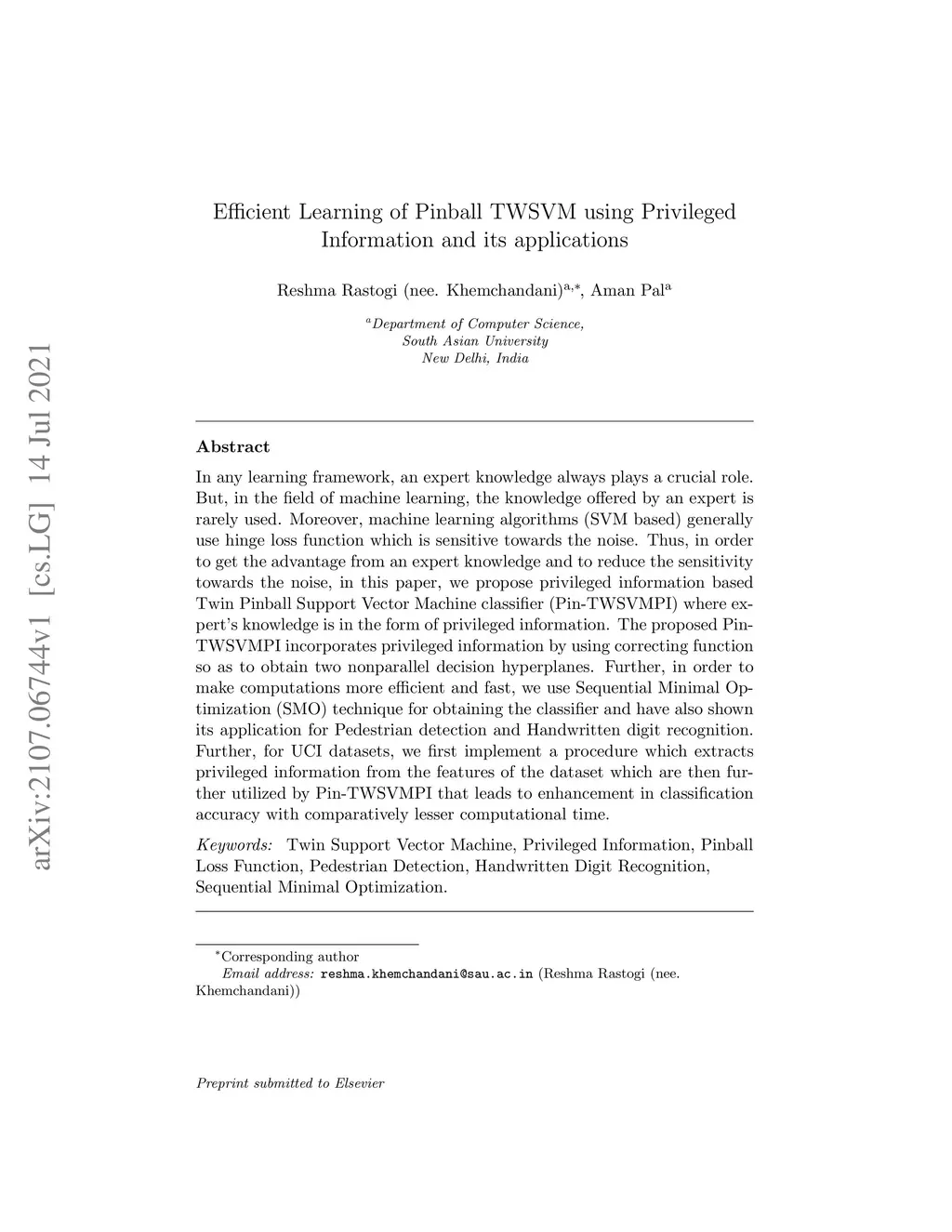 Efficient Learning of Pinball TWSVM using Privileged Information and its