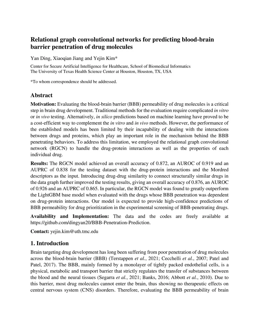 Evaluating the blood-brain barrier (BBB) permeability of drug molecules is a critical step in brain drug development. Traditional methods for the evaluation require complicated in vitro or in vivo testing. Alternatively, in silico predictions based on machine learning have proved to be a cost-efficient way to complement the in vitro and in vivo methods. However, the performance of the established models has been limited by their incapability of dealing with the interactions between drugs and proteins, which play an important role in the mechanism behind the BBB penetrating behaviors. To address this limitation, we employed the relational graph convolutional network (RGCN) to handle the drug-protein interactions as well as the properties of each individual drug. The RGCN model achieved an overall accuracy of 0.872, an AUROC of 0.919 and an AUPRC of 0.838 for the testing dataset with the drug-protein interactions and the Mordred descriptors as the input. Introducing drug-drug similarity to connect structurally similar drugs in the data graph further improved the testing results, giving an overall accuracy of 0.876, an AUROC of 0.926 and an AUPRC of 0.865. In particular, the RGCN model was found to greatly outperform the LightGBM base model when evaluated with the drugs whose BBB penetration was dependent on drug-protein interactions. Our model is expected to provide high-confidence predictions of BBB permeability for drug prioritization in the experimental screening of BBB-penetrating drugs.