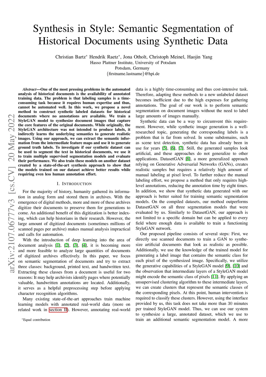 One of the most pressing problems in the automated analysis of historical documents is the availability of annotated training data. The problem is that labeling samples is a time-consuming task because it requires human expertise and thus, cannot be automated well. In this work, we propose a novel method to construct synthetic labeled datasets for historical documents where no annotations are available. We train a StyleGAN model to synthesize document images that capture the core features of the original documents. While originally, the StyleGAN architecture was not intended to produce labels, it indirectly learns the underlying semantics to generate realistic images. Using our approach, we can extract the semantic information from the intermediate feature maps and use it to generate ground truth labels. To investigate if our synthetic dataset can be used to segment the text in historical documents, we use it to train multiple supervised segmentation models and evaluate their performance. We also train these models on another dataset created by a state-of-the-art synthesis approach to show that the models trained on our dataset achieve better results while requiring even less human annotation effort.