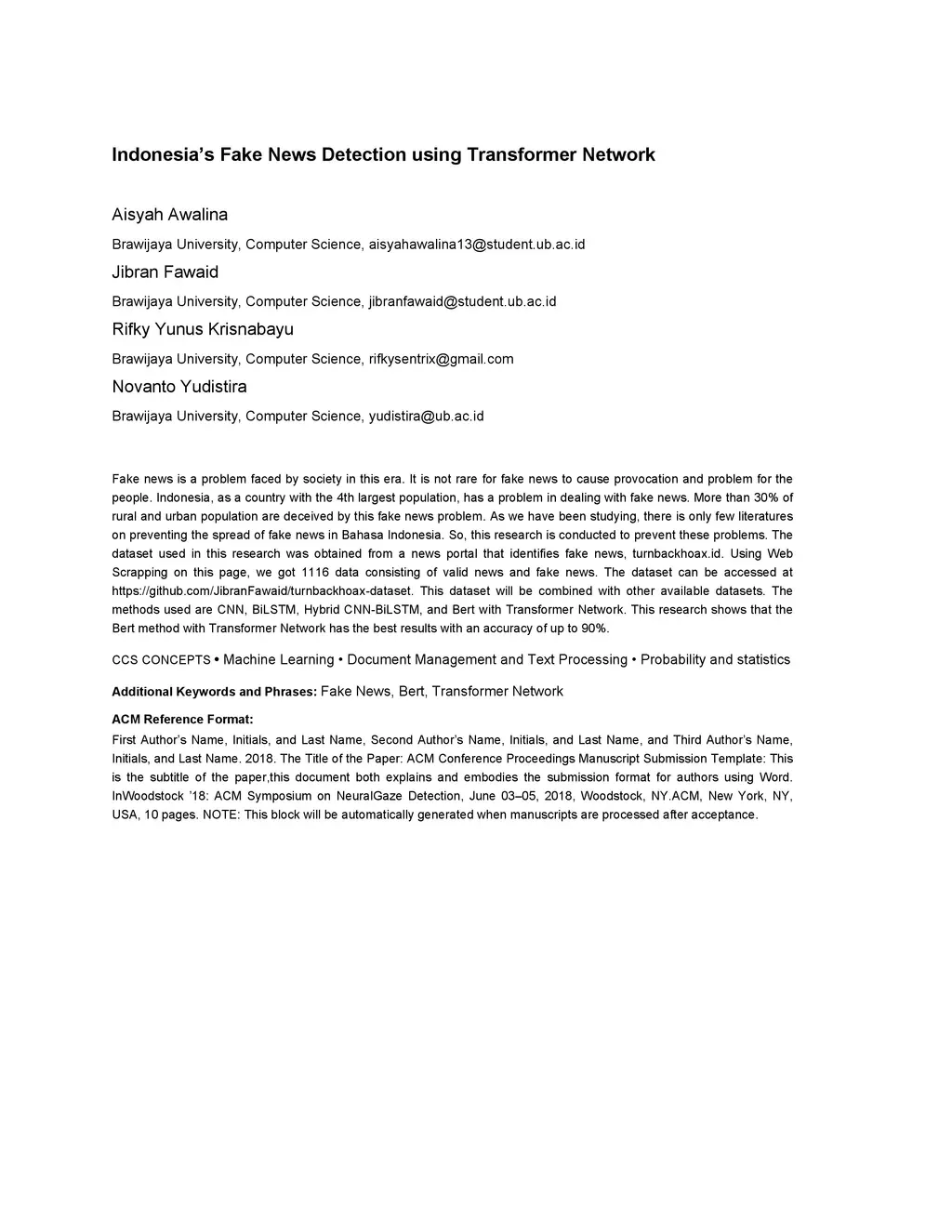 Indonesia's Fake News Detection using Transformer Network