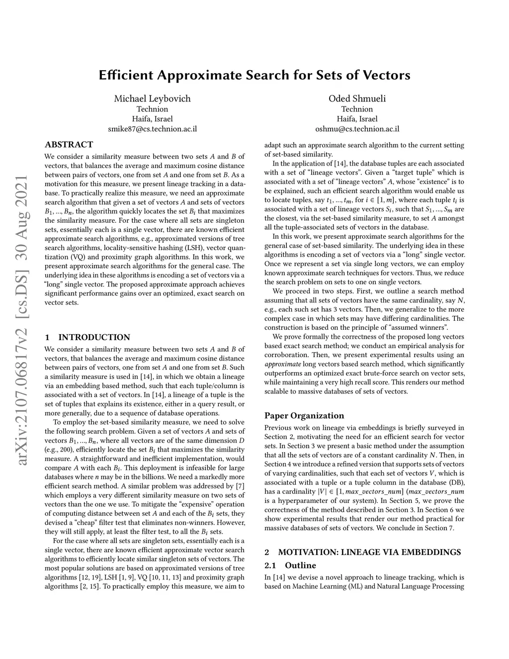We consider a similarity measure between two sets and of vectors, that balances the average and maximum cosine distance between pairs of vectors, one from set and one from set . As a motivation for this measure, we present lineage tracking in a database. To practically realize this measure, we need an approximate search algorithm that given a set of vectors and sets of vectors , the algorithm quickly locates the set that maximizes the similarity measure. For the case where all sets are singleton sets, essentially each is a single vector, there are known efficient approximate search algorithms, e.g., approximated versions of tree search algorithms, locality-sensitive hashing (LSH), vector quantization (VQ) and proximity graph algorithms. In this work, we present approximate search algorithms for the general case. The underlying idea in these algorithms is encoding a set of vectors via a "long" single vector. The proposed approximate approach achieves significant performance gains over an optimized, exact search on vector sets.