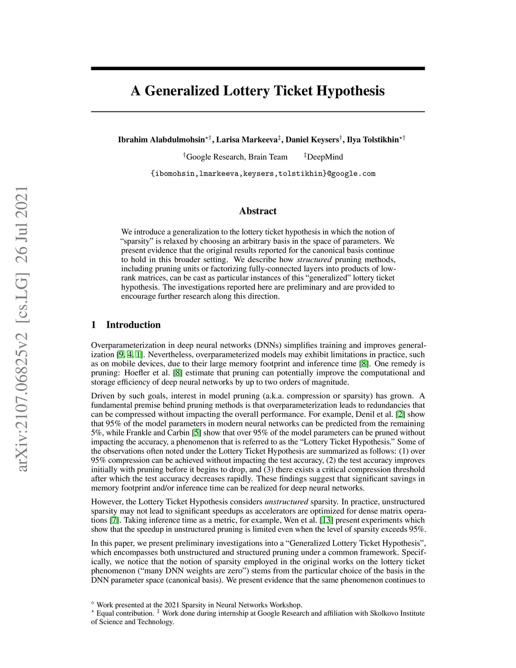 We introduce a generalization to the lottery ticket hypothesis in which the notion of "sparsity" is relaxed by choosing an arbitrary basis in the space of parameters. We present evidence that the original results reported for the canonical basis continue to hold in this broader setting. We describe how structured pruning methods, including pruning units or factorizing fully-connected layers into products of low-rank matrices, can be cast as particular instances of this "generalized" lottery ticket hypothesis. The investigations reported here are preliminary and are provided to encourage further research along this direction.