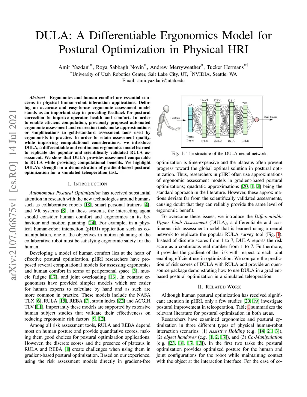 Ergonomics and human comfort are essential concerns in physical human-robot interaction applications. Defining an accurate and easy-to-use ergonomic assessment model stands as an important step in providing feedback for postural correction to improve operator health and comfort. In order to enable efficient computation, previously proposed automated ergonomic assessment and correction tools make approximations or simplifications to gold-standard assessment tools used by ergonomists in practice. In order to retain assessment quality, while improving computational considerations, we introduce DULA, a differentiable and continuous ergonomics model learned to replicate the popular and scientifically validated RULA assessment. We show that DULA provides assessment comparable to RULA while providing computational benefits. We highlight DULA's strength in a demonstration of gradient-based postural optimization for a simulated teleoperation task.