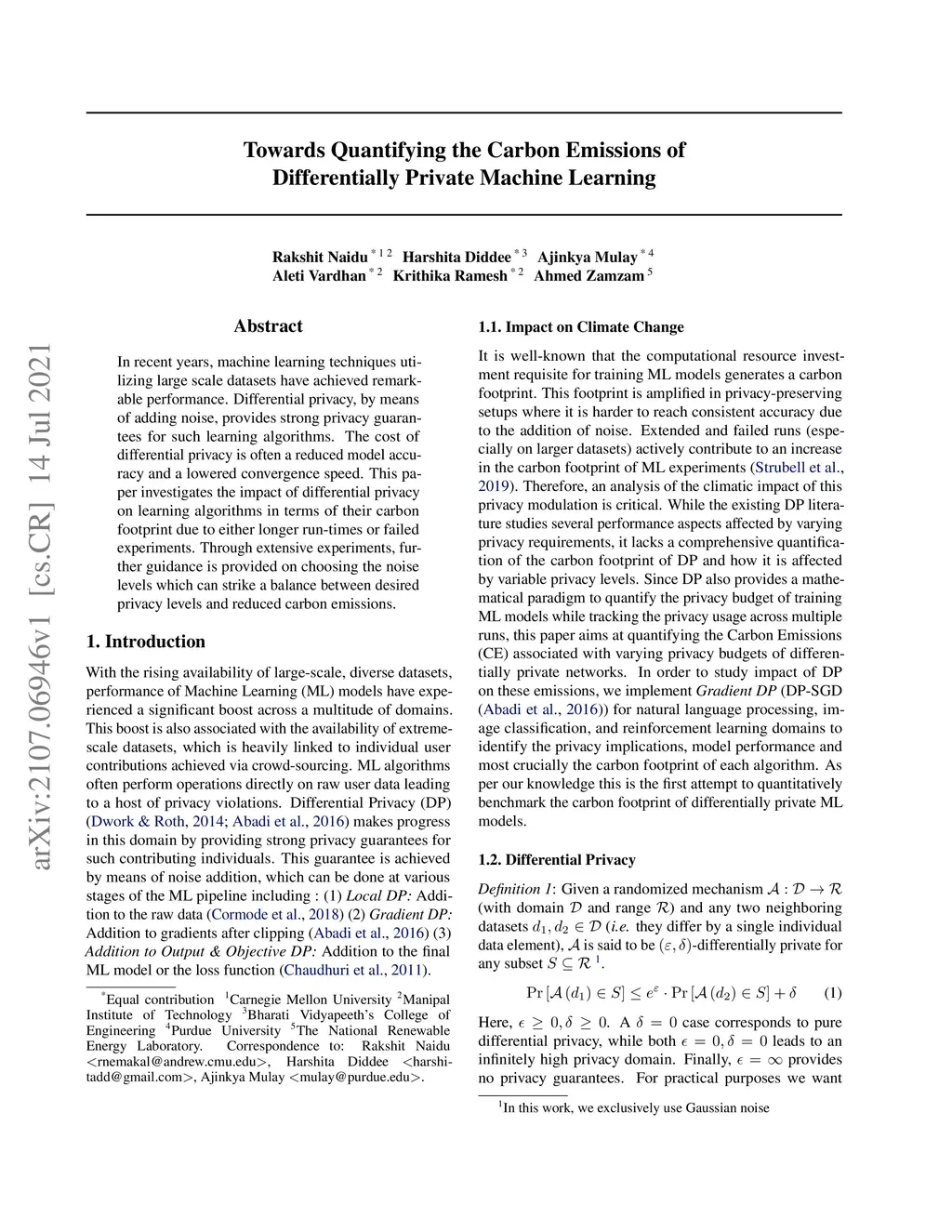In recent years, machine learning techniques utilizing large-scale datasets have achieved remarkable performance. Differential privacy, by means of adding noise, provides strong privacy guarantees for such learning algorithms. The cost of differential privacy is often a reduced model accuracy and a lowered convergence speed. This paper investigates the impact of differential privacy on learning algorithms in terms of their carbon footprint due to either longer run-times or failed experiments. Through extensive experiments, further guidance is provided on choosing the noise levels which can strike a balance between desired privacy levels and reduced carbon emissions.