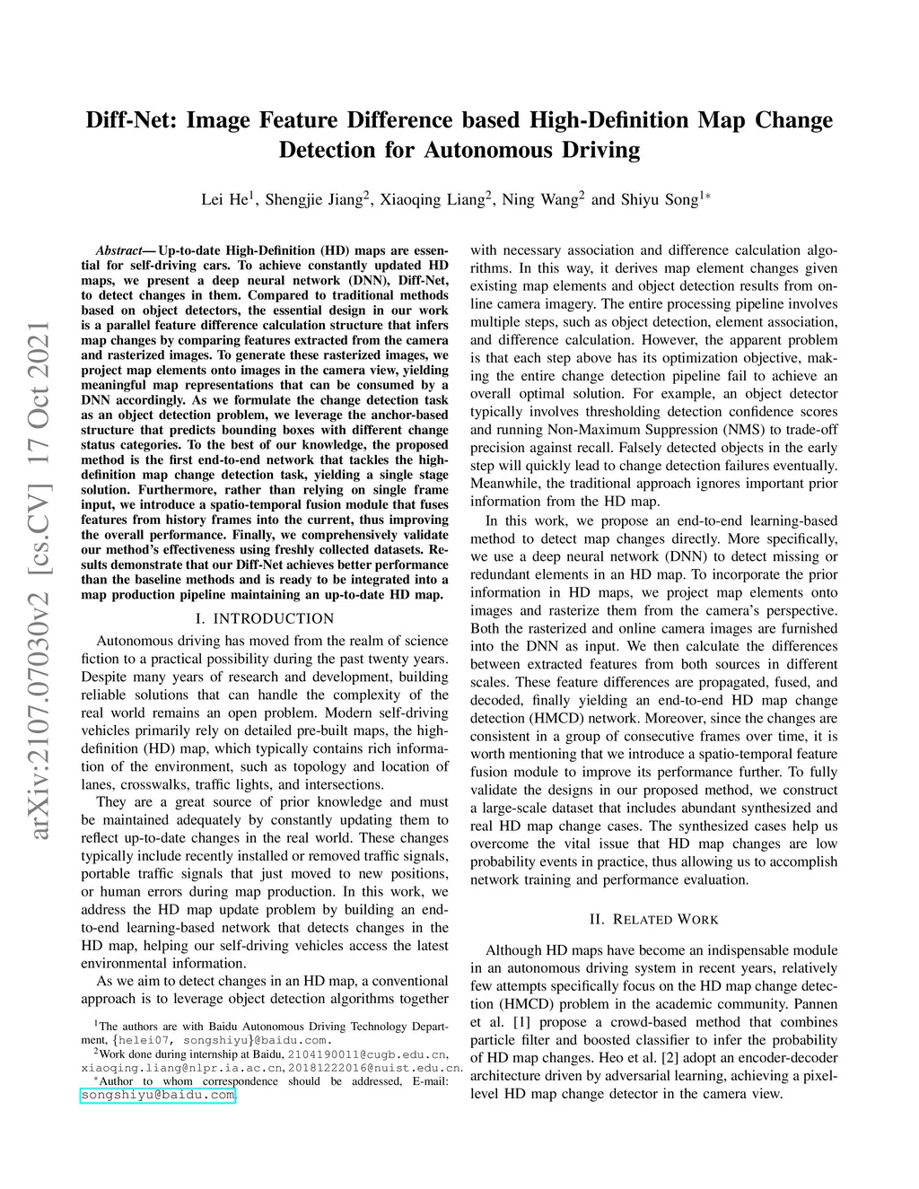 Up-to-date High-Definition (HD) maps are essential for self-driving cars. To achieve constantly updated HD maps, we present a deep neural network (DNN), Diff-Net, to detect changes in them. Compared to traditional methods based on object detectors, the essential design in our work is a parallel feature difference calculation structure that infers map changes by comparing features extracted from the camera and rasterized images. To generate these rasterized images, we project map elements onto images in the camera view, yielding meaningful map representations that can be consumed by a DNN accordingly. As we formulate the change detection task as an object detection problem, we leverage the anchor-based structure that predicts bounding boxes with different change status categories. To the best of our knowledge, the proposed method is the first end-to-end network that tackles the high-definition map change detection task, yielding a single stage solution. Furthermore, rather than relying on single frame input, we introduce a spatio-temporal fusion module that fuses features from history frames into the current, thus improving the overall performance. Finally, we comprehensively validate our method's effectiveness using freshly collected datasets. Results demonstrate that our Diff-Net achieves better performance than the baseline methods and is ready to be integrated into a map production pipeline maintaining an up-to-date HD map.