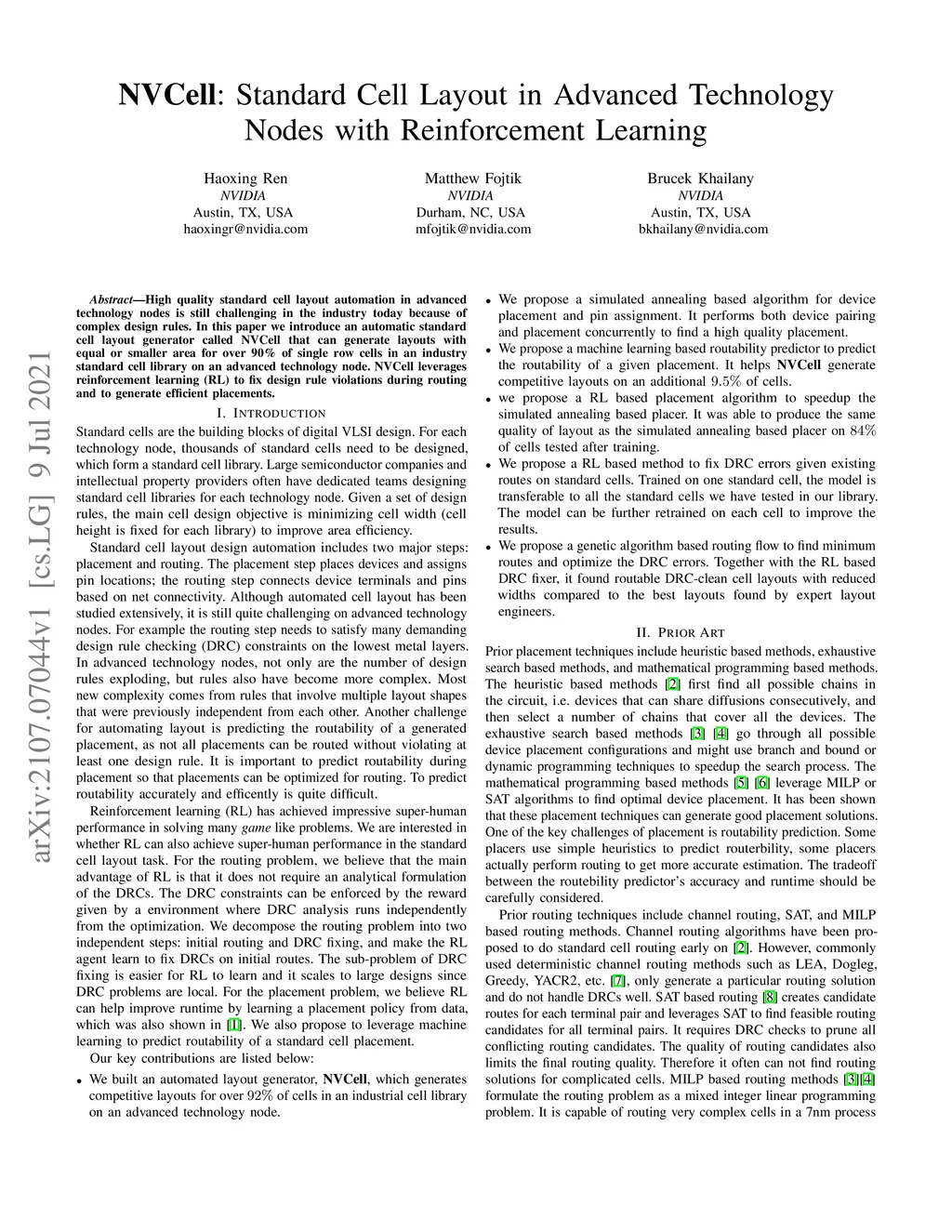 High quality standard cell layout automation in advanced technology nodes is still challenging in the industry today because of complex design rules. In this paper we introduce an automatic standard cell layout generator called NVCell that can generate layouts with equal or smaller area for over 90% of single row cells in an industry standard cell library on an advanced technology node. NVCell leverages reinforcement learning (RL) to fix design rule violations during routing and to generate efficient placements.