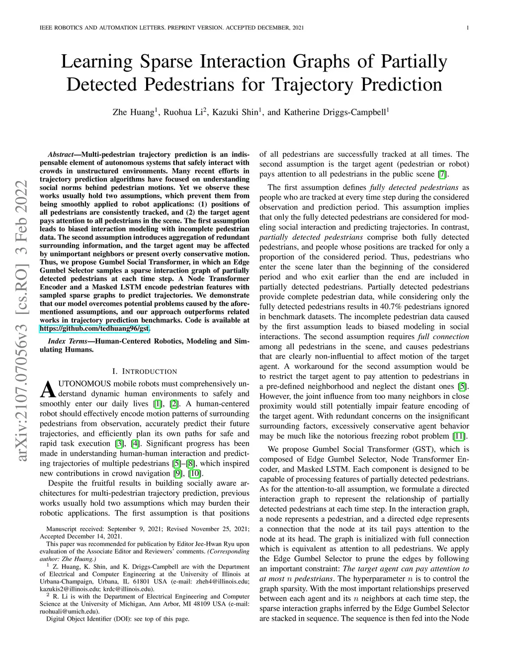 Multi-pedestrian trajectory prediction is an indispensable element of autonomous systems that safely interact with crowds in unstructured environments. Many recent efforts in trajectory prediction algorithms have focused on understanding social norms behind pedestrian motions. Yet we observe these works usually hold two assumptions, which prevent them from being smoothly applied to robot applications: (1) positions of all pedestrians are consistently tracked, and (2) the target agent pays attention to all pedestrians in the scene. The first assumption leads to biased interaction modeling with incomplete pedestrian data. The second assumption introduces aggregation of redundant surrounding information, and the target agent may be affected by unimportant neighbors or present overly conservative motion. Thus, we propose Gumbel Social Transformer, in which an Edge Gumbel Selector samples a sparse interaction graph of partially detected pedestrians at each time step. A Node Transformer Encoder and a Masked LSTM encode pedestrian features with sampled sparse graphs to predict trajectories. We demonstrate that our model overcomes potential problems caused by the aforementioned assumptions, and our approach outperforms related works in trajectory prediction benchmarks. Code is available at \url{https://github.com/tedhuang96/gst}.