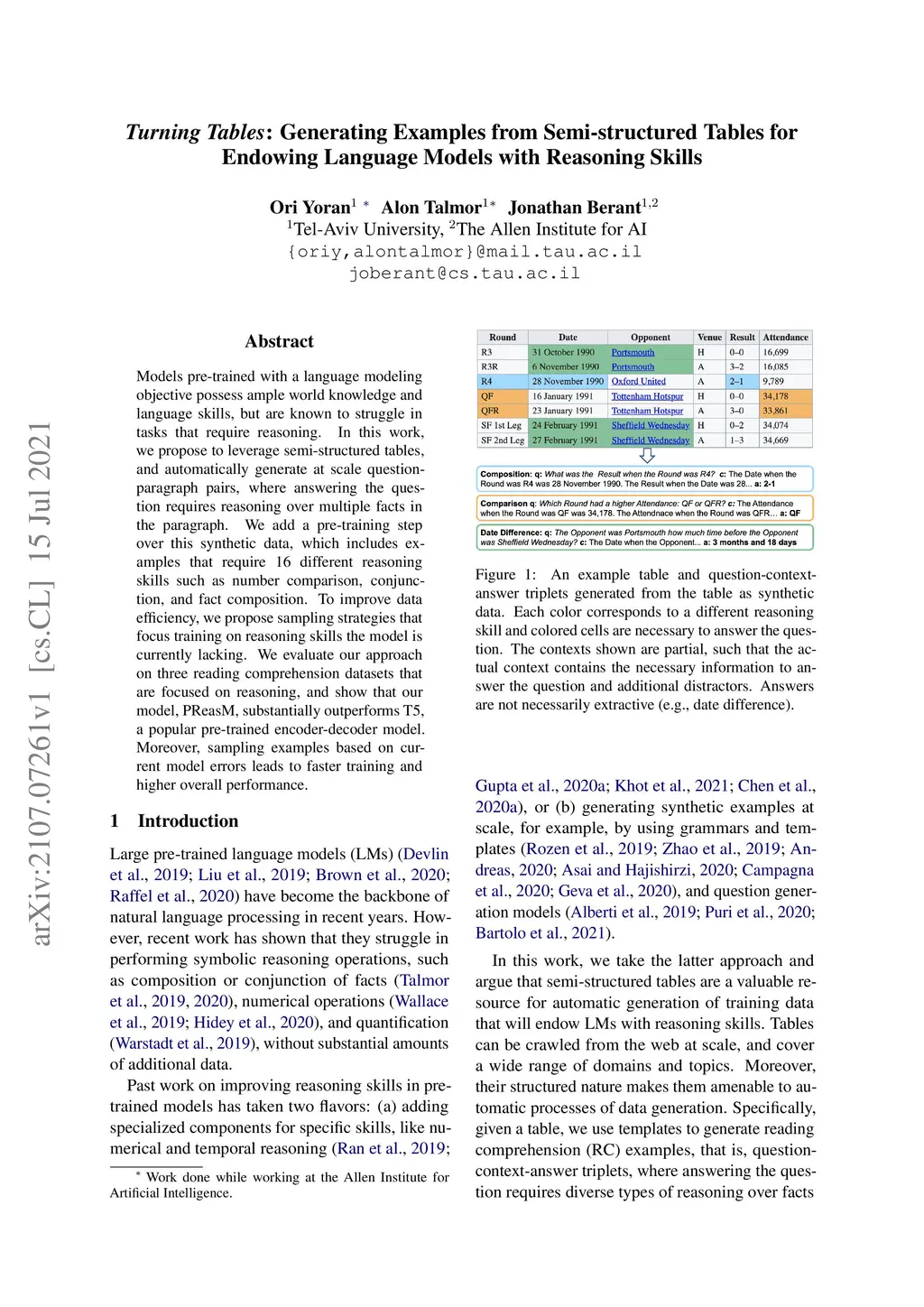 Models pre-trained with a language modeling objective possess ample world knowledge and language skills, but are known to struggle in tasks that require reasoning. In this work, we propose to leverage semi-structured tables, and automatically generate at scale question-paragraph pairs, where answering the question requires reasoning over multiple facts in the paragraph. We add a pre-training step over this synthetic data, which includes examples that require 16 different reasoning skills such as number comparison, conjunction, and fact composition. To improve data efficiency, we propose sampling strategies that focus training on reasoning skills the model is currently lacking. We evaluate our approach on three reading comprehension datasets that are focused on reasoning, and show that our model, PReasM, substantially outperforms T5, a popular pre-trained encoder-decoder model. Moreover, sampling examples based on current model errors leads to faster training and higher overall performance.