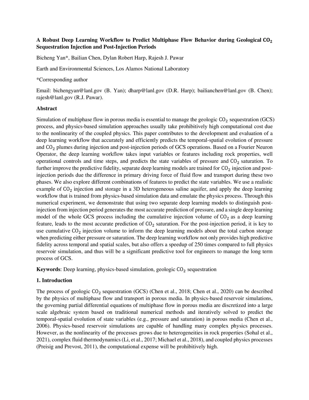 This paper contributes to the development and evaluation of a deep learning workflow that accurately and efficiently predicts the temporal-spatial evolution of pressure and CO2 plumes during injection and post-injection periods of geologic CO2 sequestration (GCS) operations. Based on a Fourier Neuron Operator, the deep learning workflow takes input variables or features including rock properties, well operational controls and time steps, and predicts the state variables of pressure and CO2 saturation. To further improve the predictive fidelity, separate deep learning models are trained for CO2 injection and post-injection periods due the difference in primary driving force of fluid flow and transport during these two phases. We also explore different combinations of features to predict the state variables. We use a realistic example of CO2 injection and storage in a 3D heterogeneous saline aquifer, and apply the deep learning workflow that is trained from physics-based simulation data and emulate the physics process. Through this numerical experiment, we demonstrate that using two separate deep learning models to distinguish post-injection from injection period generates the most accurate prediction of pressure, and a single deep learning model of the whole GCS process including the cumulative injection volume of CO2 as a deep learning feature, leads to the most accurate prediction of CO2 saturation. For the post-injection period, it is key to use cumulative CO2 injection volume to inform the deep learning models about the total carbon storage when predicting either pressure or saturation. The deep learning workflow not only provides high predictive fidelity across temporal and spatial scales, but also offers a speedup of 250 times compared to full physics reservoir simulation, and thus will be a significant predictive tool for engineers to manage the long term process of GCS.