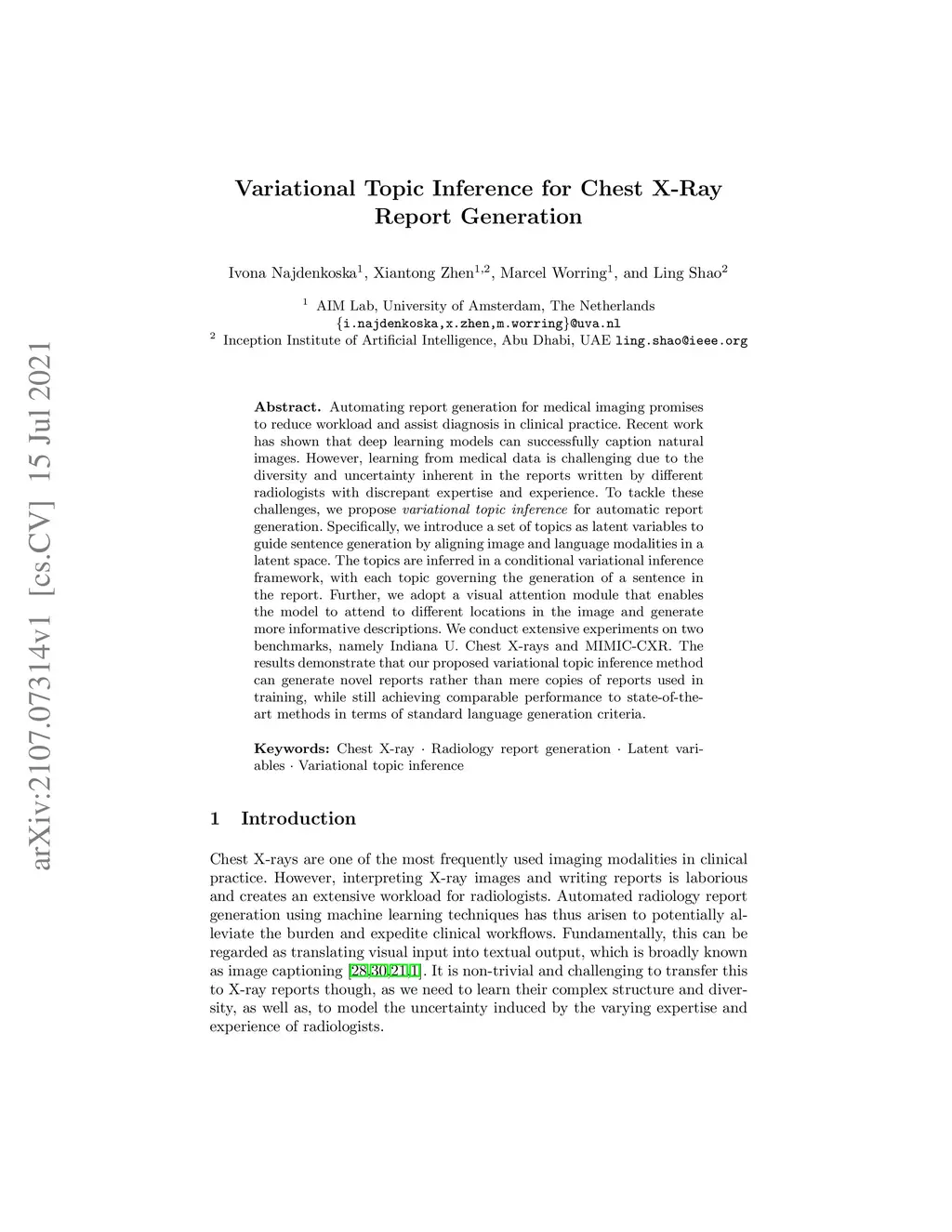 Automating report generation for medical imaging promises to reduce workload and assist diagnosis in clinical practice. Recent work has shown that deep learning models can successfully caption natural images. However, learning from medical data is challenging due to the diversity and uncertainty inherent in the reports written by different radiologists with discrepant expertise and experience. To tackle these challenges, we propose variational topic inference for automatic report generation. Specifically, we introduce a set of topics as latent variables to guide sentence generation by aligning image and language modalities in a latent space. The topics are inferred in a conditional variational inference framework, with each topic governing the generation of a sentence in the report. Further, we adopt a visual attention module that enables the model to attend to different locations in the image and generate more informative descriptions. We conduct extensive experiments on two benchmarks, namely Indiana U. Chest X-rays and MIMIC-CXR. The results demonstrate that our proposed variational topic inference method can generate novel reports rather than mere copies of reports used in training, while still achieving comparable performance to state-of-the-art methods in terms of standard language generation criteria.