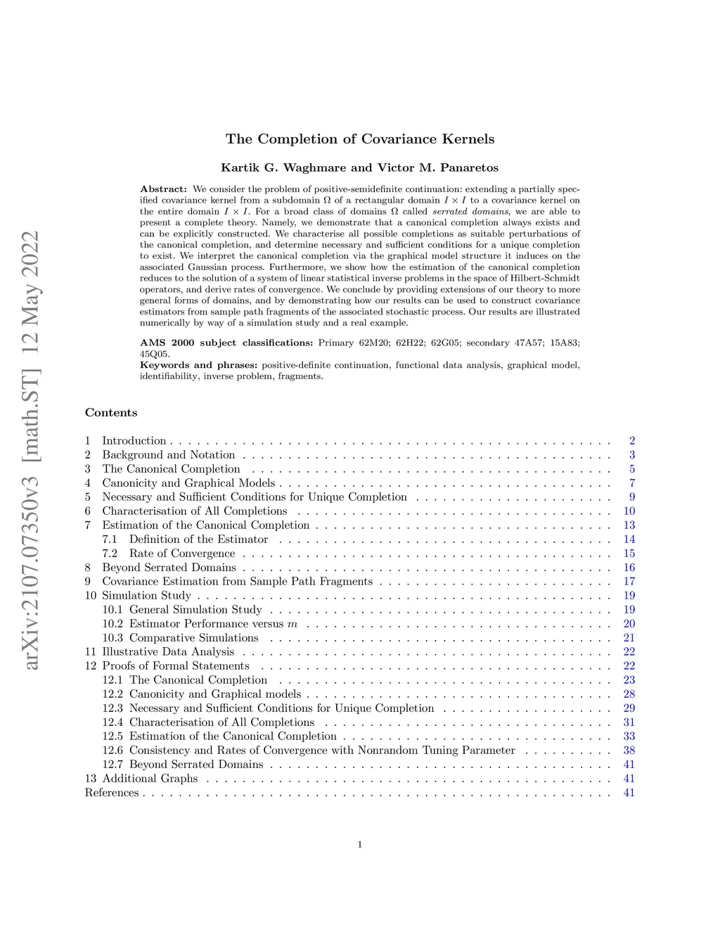We consider the problem of positive-semidefinite continuation: extending a partially specified covariance kernel from a subdomain of a rectangular domain to a covariance kernel on the entire domain . For a broad class of domains called \emph{serrated domains}, we are able to present a complete theory. Namely, we demonstrate that a canonical completion always exists and can be explicitly constructed. We characterise all possible completions as suitable perturbations of the canonical completion, and determine necessary and sufficient conditions for a unique completion to exist. We interpret the canonical completion via the graphical model structure it induces on the associated Gaussian process. Furthermore, we show how the estimation of the canonical completion reduces to the solution of a system of linear statistical inverse problems in the space of Hilbert-Schmidt operators, and derive rates of convergence. We conclude by providing extensions of our theory to more general forms of domains, and by demonstrating how our results can be used to construct covariance estimators from sample path fragments of the associated stochastic process. Our results are illustrated numerically by way of a simulation study and a real example.
