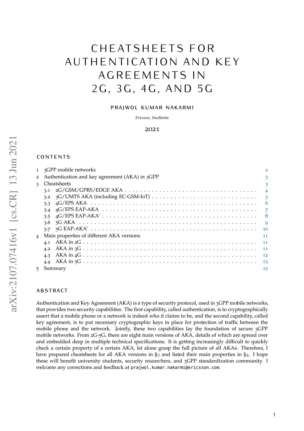Authentication and Key Agreement (AKA) is a type of security protocol, used in 3GPP mobile networks, that provides two security capabilities. The first capability, called authentication, is to cryptographically assert that a mobile phone or a network is indeed who it claims to be, and the second capability, called key agreement, is to put necessary cryptographic keys in place for protection of traffic between the mobile phone and the network. Jointly, these two capabilities lay the foundation of secure 3GPP mobile networks. From 2G-5G, there are eight main versions of AKA, details of which are spread over and embedded deep in multiple technical specifications. It is getting increasingly difficult to quickly check a certain property of a certain AKA, let alone grasp the full picture of all AKAs. Therefore, I have prepared cheatsheets for all AKA versions and listed their main properties. I hope these will benefit university students, security researchers, and 3GPP standardization community. I welcome any corrections and feedback.