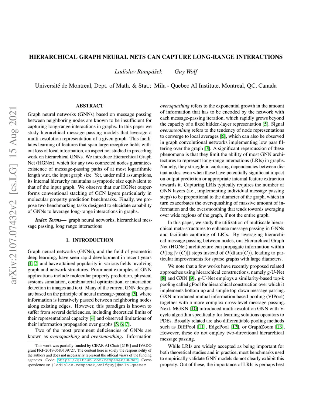 Graph neural networks (GNNs) based on message passing between neighboring nodes are known to be insufficient for capturing long-range interactions in graphs. In this project we study hierarchical message passing models that leverage a multi-resolution representation of a given graph. This facilitates learning of features that span large receptive fields without loss of local information, an aspect not studied in preceding work on hierarchical GNNs. We introduce Hierarchical Graph Net (HGNet), which for any two connected nodes guarantees existence of message-passing paths of at most logarithmic length w.r.t. the input graph size. Yet, under mild assumptions, its internal hierarchy maintains asymptotic size equivalent to that of the input graph. We observe that our HGNet outperforms conventional stacking of GCN layers particularly in molecular property prediction benchmarks. Finally, we propose two benchmarking tasks designed to elucidate capability of GNNs to leverage long-range interactions in graphs.