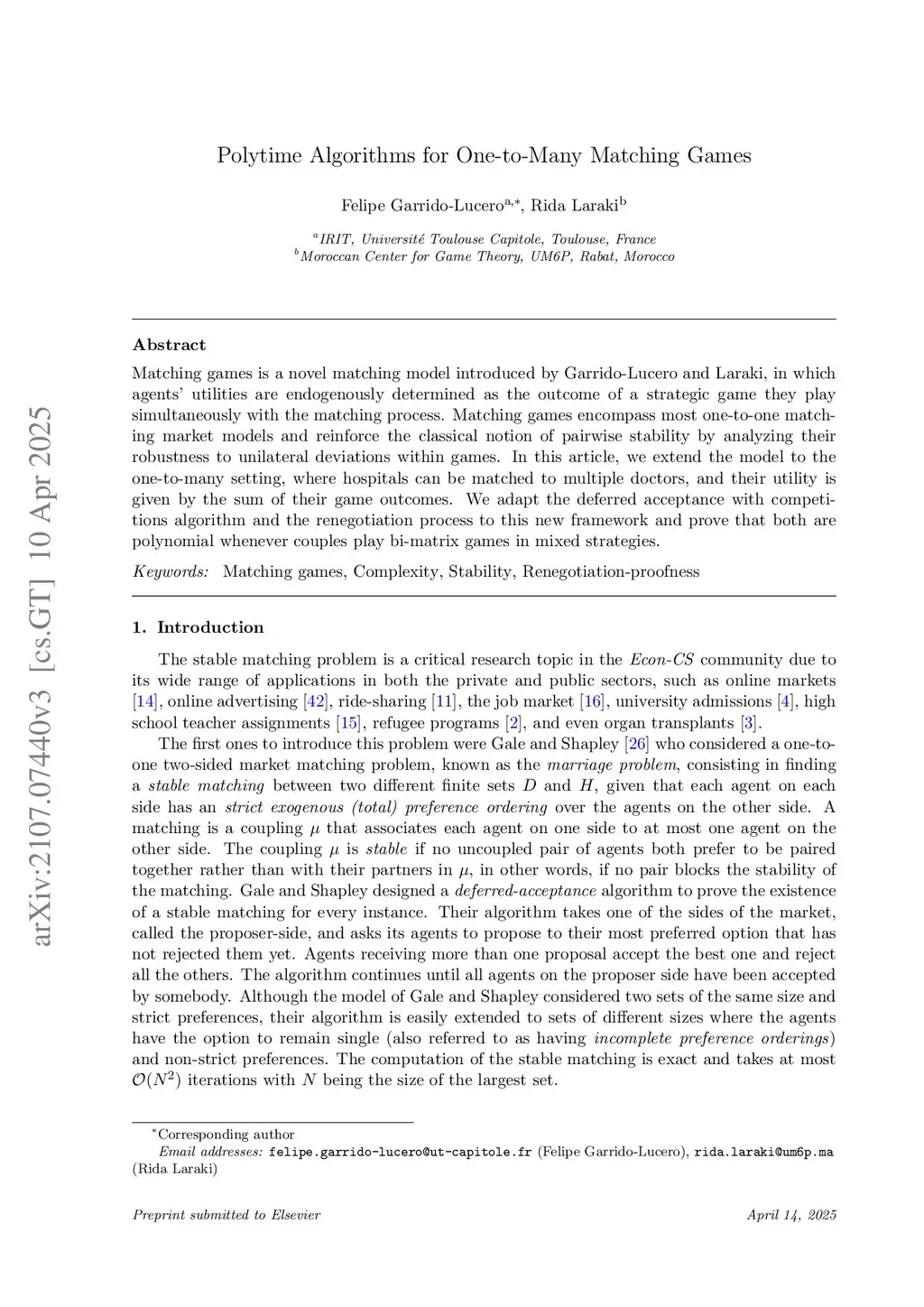 Polytime Algorithms for One-to-Many Matching Games
