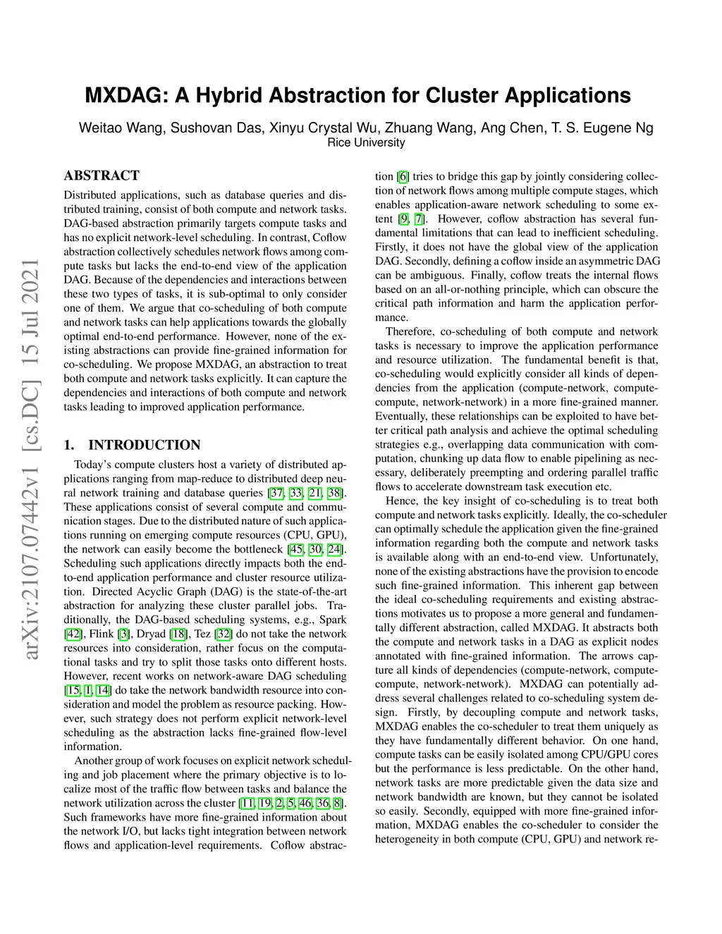 Distributed applications, such as database queries and distributed training, consist of both compute and network tasks. DAG-based abstraction primarily targets compute tasks and has no explicit network-level scheduling. In contrast, Coflow abstraction collectively schedules network flows among compute tasks but lacks the end-to-end view of the application DAG. Because of the dependencies and interactions between these two types of tasks, it is sub-optimal to only consider one of them. We argue that co-scheduling of both compute and network tasks can help applications towards the globally optimal end-to-end performance. However, none of the existing abstractions can provide fine-grained information for co-scheduling. We propose MXDAG, an abstraction to treat both compute and network tasks explicitly. It can capture the dependencies and interactions of both compute and network tasks leading to improved application performance.
