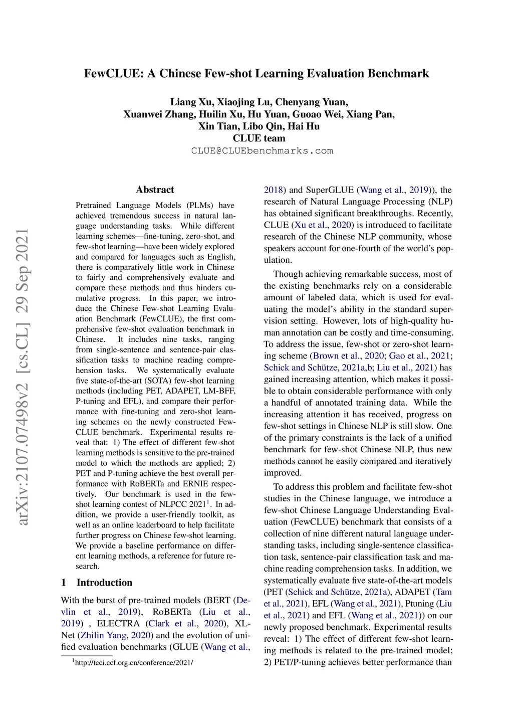 FewCLUE: A Chinese Few-shot Learning Evaluation Benchmark
