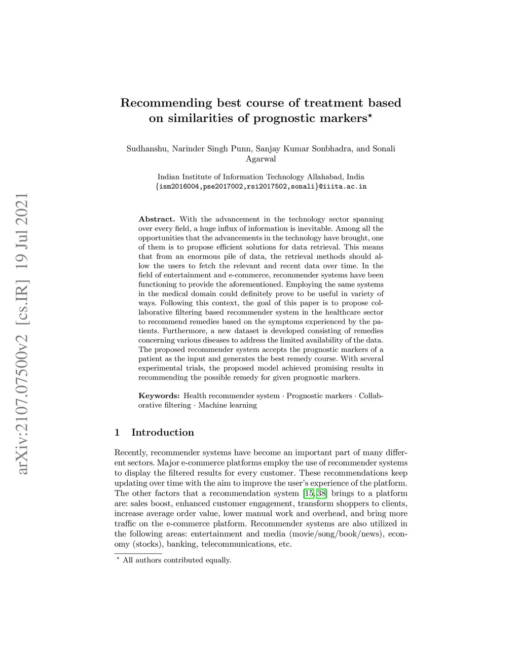 With the advancement in the technology sector spanning over every field, a huge influx of information is inevitable. Among all the opportunities that the advancements in the technology have brought, one of them is to propose efficient solutions for data retrieval. This means that from an enormous pile of data, the retrieval methods should allow the users to fetch the relevant and recent data over time. In the field of entertainment and e-commerce, recommender systems have been functioning to provide the aforementioned. Employing the same systems in the medical domain could definitely prove to be useful in variety of ways. Following this context, the goal of this paper is to propose collaborative filtering based recommender system in the healthcare sector to recommend remedies based on the symptoms experienced by the patients. Furthermore, a new dataset is developed consisting of remedies concerning various diseases to address the limited availability of the data. The proposed recommender system accepts the prognostic markers of a patient as the input and generates the best remedy course. With several experimental trials, the proposed model achieved promising results in recommending the possible remedy for given prognostic markers.