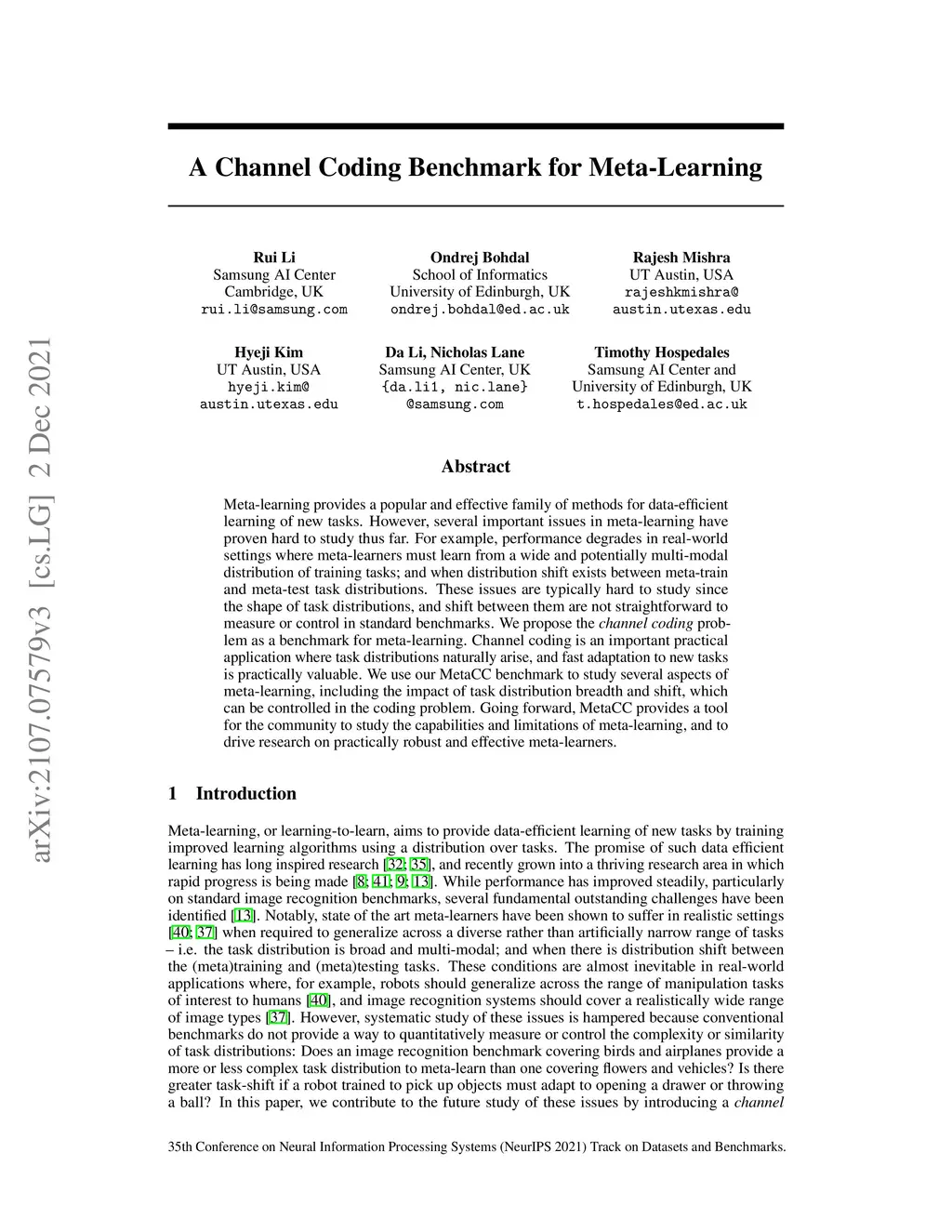 A Channel Coding Benchmark for Meta-Learning