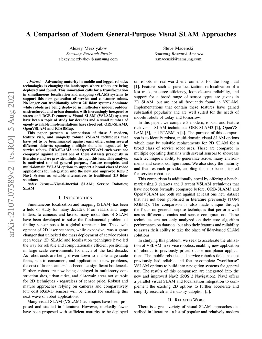 Advancing maturity in mobile and legged robotics technologies is changing the landscapes where robots are being deployed and found. This innovation calls for a transformation in simultaneous localization and mapping (SLAM) systems to support this new generation of service and consumer robots. No longer can traditionally robust 2D lidar systems dominate while robots are being deployed in multi-story indoor, outdoor unstructured, and urban domains with increasingly inexpensive stereo and RGB-D cameras. Visual SLAM (VSLAM) systems have been a topic of study for decades and a small number of openly available implementations have stood out: ORB-SLAM3, OpenVSLAM and RTABMap. This paper presents a comparison of these 3 modern, feature rich, and uniquely robust VSLAM techniques that have yet to be benchmarked against each other, using several different datasets spanning multiple domains negotiated by service robots. ORB-SLAM3 and OpenVSLAM each were not compared against at least one of these datasets previously in literature and we provide insight through this lens. This analysis is motivated to find general purpose, feature complete, and multi-domain VSLAM options to support a broad class of robot applications for integration into the new and improved ROS 2 Nav2 System as suitable alternatives to traditional 2D lidar solutions.