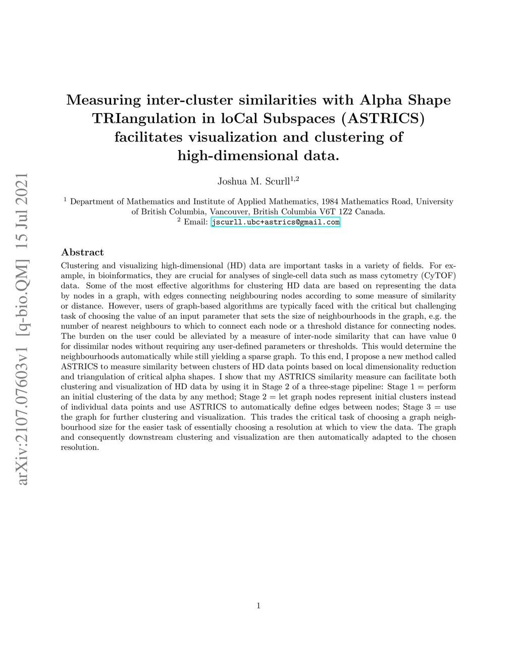 Clustering and visualizing high-dimensional (HD) data are important tasks in a variety of fields. For example, in bioinformatics, they are crucial for analyses of single-cell data such as mass cytometry (CyTOF) data. Some of the most effective algorithms for clustering HD data are based on representing the data by nodes in a graph, with edges connecting neighbouring nodes according to some measure of similarity or distance. However, users of graph-based algorithms are typically faced with the critical but challenging task of choosing the value of an input parameter that sets the size of neighbourhoods in the graph, e.g. the number of nearest neighbours to which to connect each node or a threshold distance for connecting nodes. The burden on the user could be alleviated by a measure of inter-node similarity that can have value 0 for dissimilar nodes without requiring any user-defined parameters or thresholds. This would determine the neighbourhoods automatically while still yielding a sparse graph. To this end, I propose a new method called ASTRICS to measure similarity between clusters of HD data points based on local dimensionality reduction and triangulation of critical alpha shapes. I show that my ASTRICS similarity measure can facilitate both clustering and visualization of HD data by using it in Stage 2 of a three-stage pipeline: Stage 1 = perform an initial clustering of the data by any method; Stage 2 = let graph nodes represent initial clusters instead of individual data points and use ASTRICS to automatically define edges between nodes; Stage 3 = use the graph for further clustering and visualization. This trades the critical task of choosing a graph neighbourhood size for the easier task of essentially choosing a resolution at which to view the data. The graph and consequently downstream clustering and visualization are then automatically adapted to the chosen resolution.