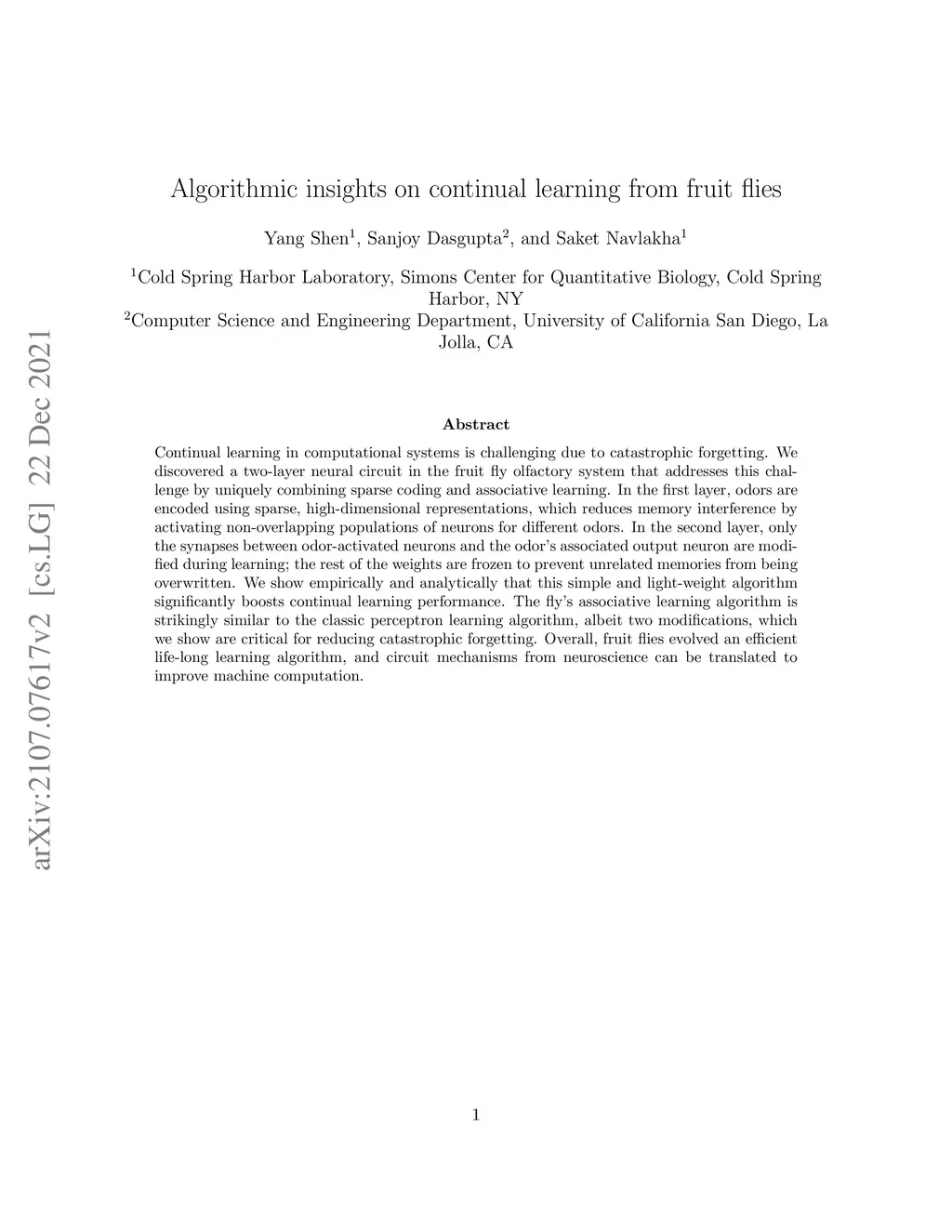 Continual learning in computational systems is challenging due to catastrophic forgetting. We discovered a two layer neural circuit in the fruit fly olfactory system that addresses this challenge by uniquely combining sparse coding and associative learning. In the first layer, odors are encoded using sparse, high dimensional representations, which reduces memory interference by activating non overlapping populations of neurons for different odors. In the second layer, only the synapses between odor activated neurons and the output neuron associated with the odor are modified during learning; the rest of the weights are frozen to prevent unrelated memories from being overwritten. We show empirically and analytically that this simple and lightweight algorithm significantly boosts continual learning performance. The fly associative learning algorithm is strikingly similar to the classic perceptron learning algorithm, albeit two modifications, which we show are critical for reducing catastrophic forgetting. Overall, fruit flies evolved an efficient lifelong learning algorithm, and circuit mechanisms from neuroscience can be translated to improve machine computation.