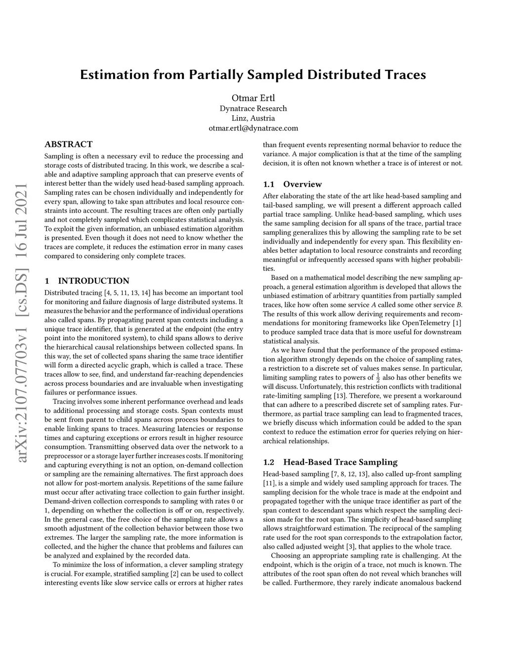 Sampling is often a necessary evil to reduce the processing and storage costs of distributed tracing. In this work, we describe a scalable and adaptive sampling approach that can preserve events of interest better than the widely used head-based sampling approach. Sampling rates can be chosen individually and independently for every span, allowing to take span attributes and local resource constraints into account. The resulting traces are often only partially and not completely sampled which complicates statistical analysis. To exploit the given information, an unbiased estimation algorithm is presented. Even though it does not need to know whether the traces are complete, it reduces the estimation error in many cases compared to considering only complete traces.