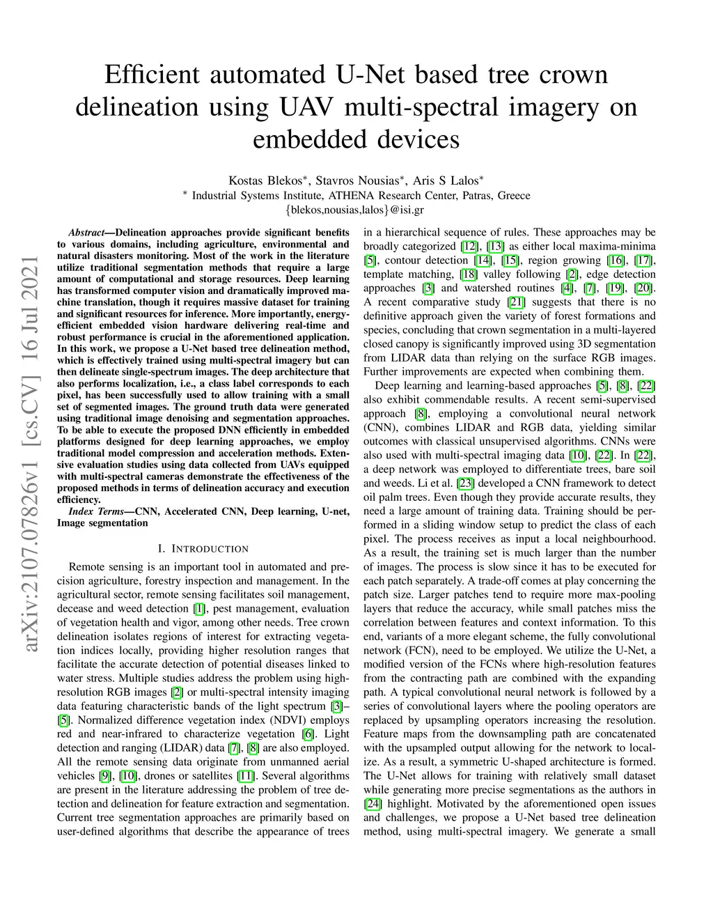 Delineation approaches provide significant benefits to various domains, including agriculture, environmental and natural disasters monitoring. Most of the work in the literature utilize traditional segmentation methods that require a large amount of computational and storage resources. Deep learning has transformed computer vision and dramatically improved machine translation, though it requires massive dataset for training and significant resources for inference. More importantly, energy-efficient embedded vision hardware delivering real-time and robust performance is crucial in the aforementioned application. In this work, we propose a U-Net based tree delineation method, which is effectively trained using multi-spectral imagery but can then delineate single-spectrum images. The deep architecture that also performs localization, i.e., a class label corresponds to each pixel, has been successfully used to allow training with a small set of segmented images. The ground truth data were generated using traditional image denoising and segmentation approaches. To be able to execute the proposed DNN efficiently in embedded platforms designed for deep learning approaches, we employ traditional model compression and acceleration methods. Extensive evaluation studies using data collected from UAVs equipped with multi-spectral cameras demonstrate the effectiveness of the proposed methods in terms of delineation accuracy and execution efficiency.
