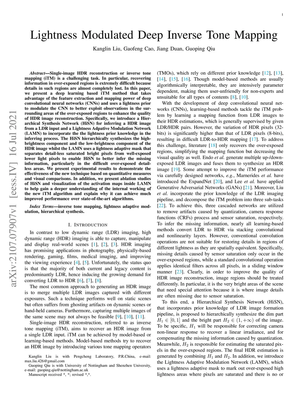 Single-image HDR reconstruction or inverse tone mapping (iTM) is a challenging task. In particular, recovering information in over-exposed regions is extremely difficult because details in such regions are almost completely lost. In this paper, we present a deep learning based iTM method that takes advantage of the feature extraction and mapping power of deep convolutional neural networks (CNNs) and uses a lightness prior to modulate the CNN to better exploit observations in the surrounding areas of the over-exposed regions to enhance the quality of HDR image reconstruction. Specifically, we introduce a Hierarchical Synthesis Network (HiSN) for inferring a HDR image from a LDR input and a Lightness Adpative Modulation Network (LAMN) to incorporate the the lightness prior knowledge in the inferring process. The HiSN hierarchically synthesizes the high-brightness component and the low-brightness component of the HDR image whilst the LAMN uses a lightness adaptive mask that separates detail-less saturated bright pixels from well-exposed lower light pixels to enable HiSN to better infer the missing information, particularly in the difficult over-exposed detail-less areas. We present experimental results to demonstrate the effectiveness of the new technique based on quantitative measures and visual comparisons. In addition, we present ablation studies of HiSN and visualization of the activation maps inside LAMN to help gain a deeper understanding of the internal working of the new iTM algorithm and explain why it can achieve much improved performance over state-of-the-art algorithms.