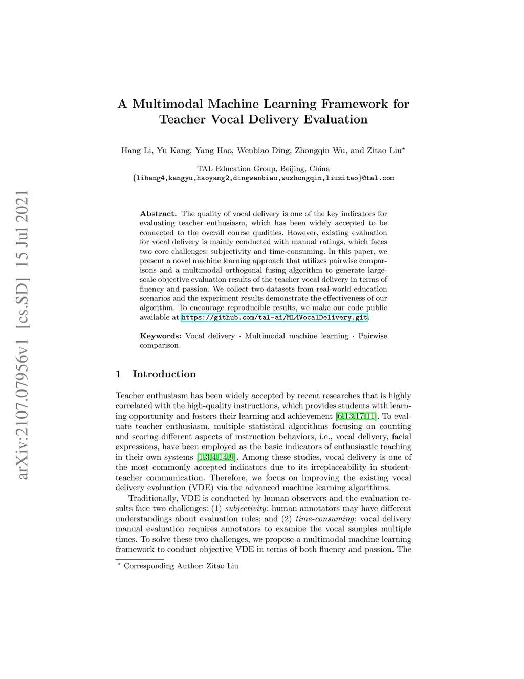 The quality of vocal delivery is one of the key indicators for evaluating teacher enthusiasm, which has been widely accepted to be connected to the overall course qualities. However, existing evaluation for vocal delivery is mainly conducted with manual ratings, which faces two core challenges: subjectivity and time-consuming. In this paper, we present a novel machine learning approach that utilizes pairwise comparisons and a multimodal orthogonal fusing algorithm to generate large-scale objective evaluation results of the teacher vocal delivery in terms of fluency and passion. We collect two datasets from real-world education scenarios and the experiment results demonstrate the effectiveness of our algorithm. To encourage reproducible results, we make our code public available at \url{https://github.com/tal-ai/ML4VocalDelivery.git}.