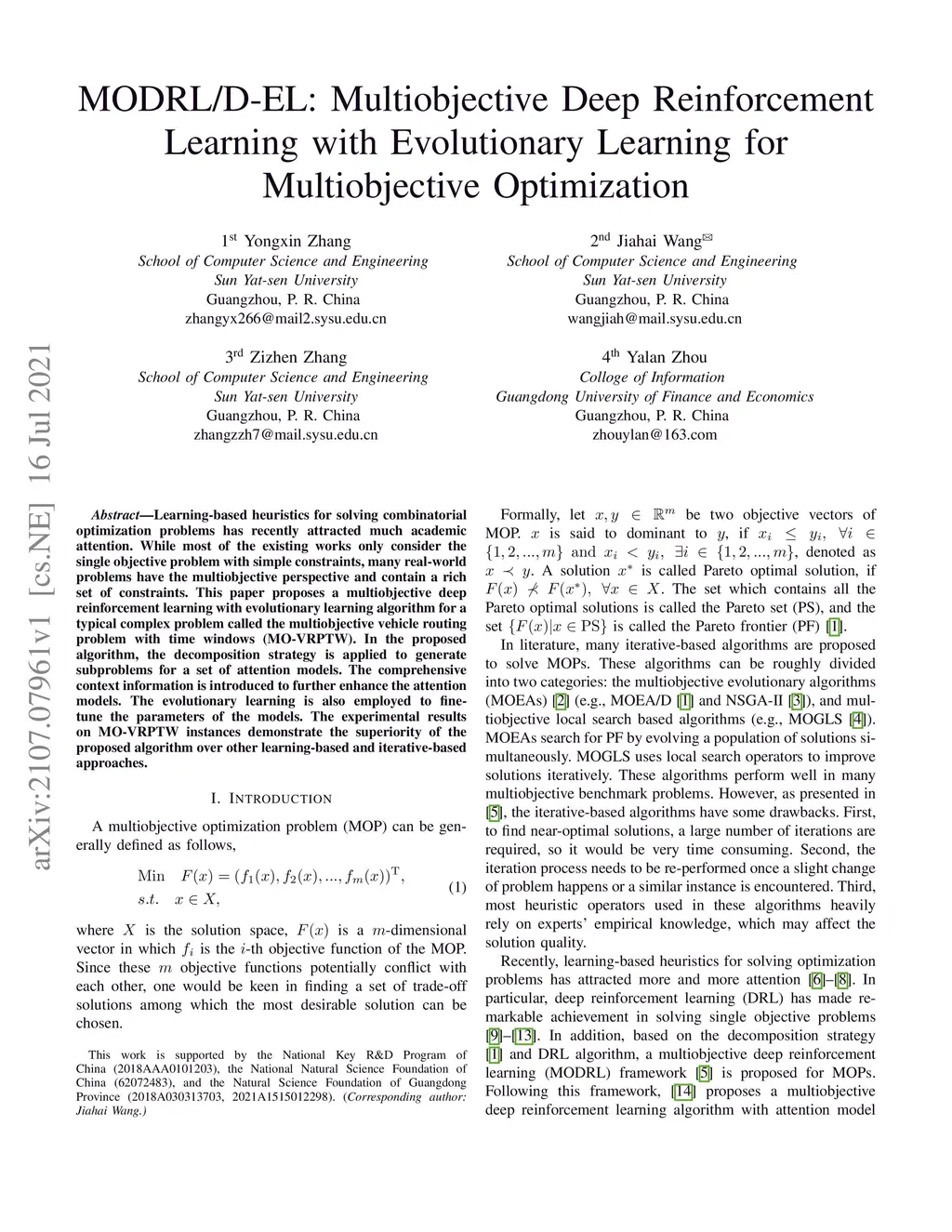 Learning-based heuristics for solving combinatorial optimization problems has recently attracted much academic attention. While most of the existing works only consider the single objective problem with simple constraints, many real-world problems have the multiobjective perspective and contain a rich set of constraints. This paper proposes a multiobjective deep reinforcement learning with evolutionary learning algorithm for a typical complex problem called the multiobjective vehicle routing problem with time windows (MO-VRPTW). In the proposed algorithm, the decomposition strategy is applied to generate subproblems for a set of attention models. The comprehensive context information is introduced to further enhance the attention models. The evolutionary learning is also employed to fine-tune the parameters of the models. The experimental results on MO-VRPTW instances demonstrate the superiority of the proposed algorithm over other learning-based and iterative-based approaches.