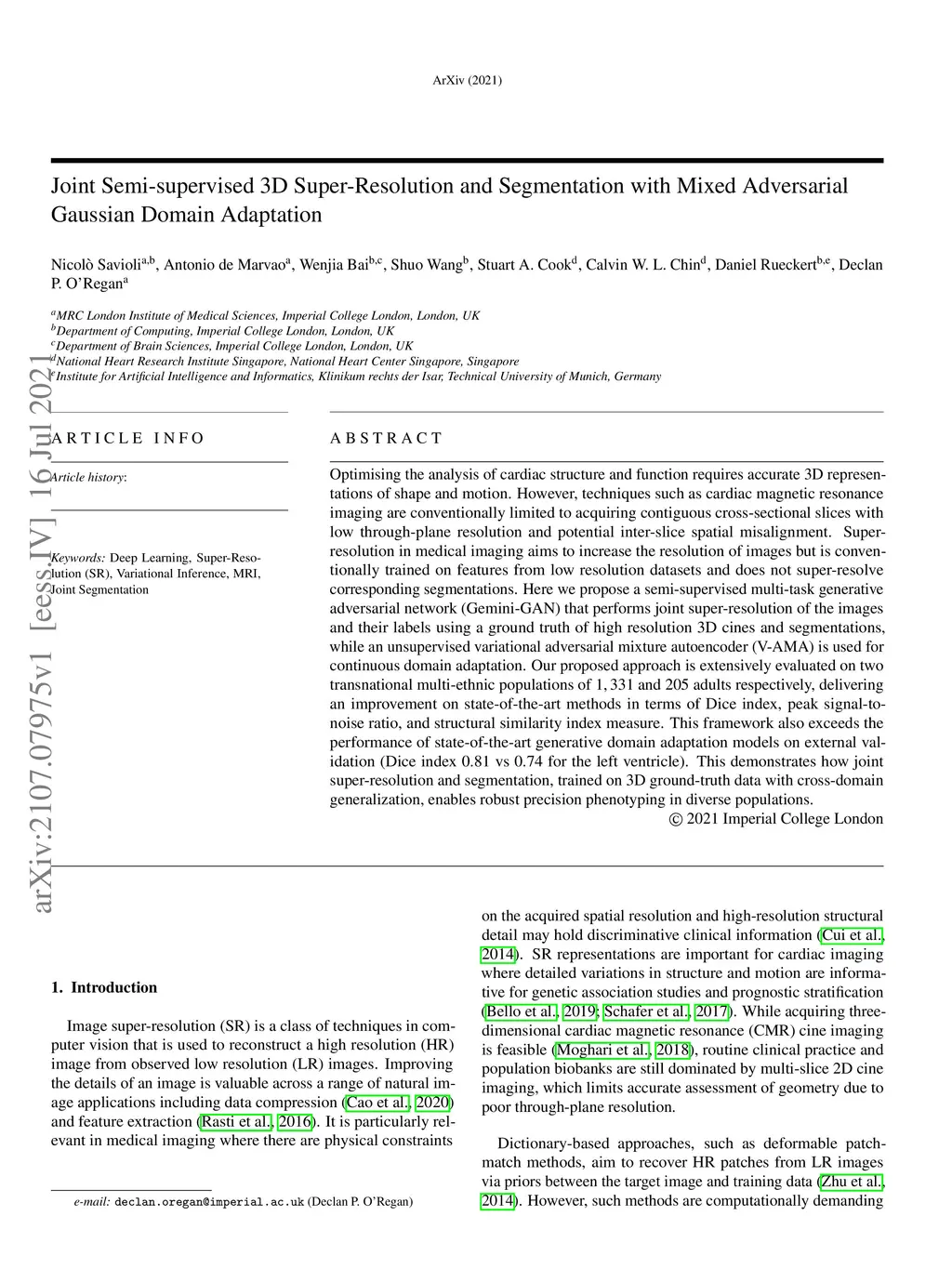 Optimising the analysis of cardiac structure and function requires accurate 3D representations of shape and motion. However, techniques such as cardiac magnetic resonance imaging are conventionally limited to acquiring contiguous cross-sectional slices with low through-plane resolution and potential inter-slice spatial misalignment. Super-resolution in medical imaging aims to increase the resolution of images but is conventionally trained on features from low resolution datasets and does not super-resolve corresponding segmentations. Here we propose a semi-supervised multi-task generative adversarial network (Gemini-GAN) that performs joint super-resolution of the images and their labels using a ground truth of high resolution 3D cines and segmentations, while an unsupervised variational adversarial mixture autoencoder (V-AMA) is used for continuous domain adaptation. Our proposed approach is extensively evaluated on two transnational multi-ethnic populations of 1,331 and 205 adults respectively, delivering an improvement on state of the art methods in terms of Dice index, peak signal to noise ratio, and structural similarity index measure. This framework also exceeds the performance of state of the art generative domain adaptation models on external validation (Dice index 0.81 vs 0.74 for the left ventricle). This demonstrates how joint super-resolution and segmentation, trained on 3D ground-truth data with cross-domain generalization, enables robust precision phenotyping in diverse populations.