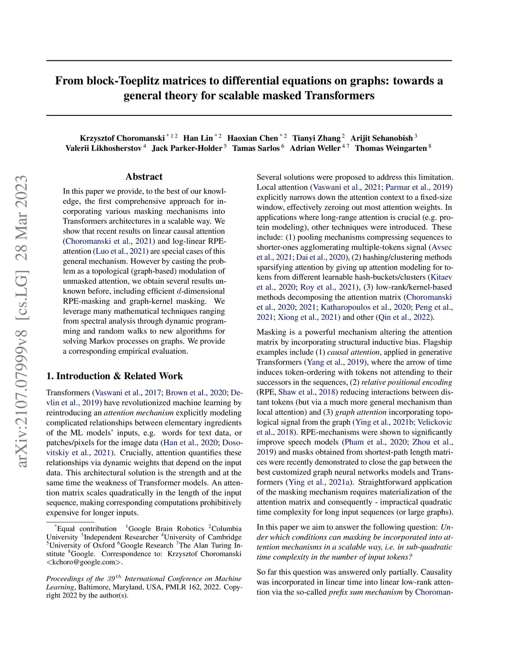 In this paper we provide, to the best of our knowledge, the first comprehensive approach for incorporating various masking mechanisms into Transformers architectures in a scalable way. We show that recent results on linear causal attention (Choromanski et al., 2021) and log-linear RPE-attention (Luo et al., 2021) are special cases of this general mechanism. However by casting the problem as a topological (graph-based) modulation of unmasked attention, we obtain several results unknown before, including efficient d-dimensional RPE-masking and graph-kernel masking. We leverage many mathematical techniques ranging from spectral analysis through dynamic programming and random walks to new algorithms for solving Markov processes on graphs. We provide a corresponding empirical evaluation.