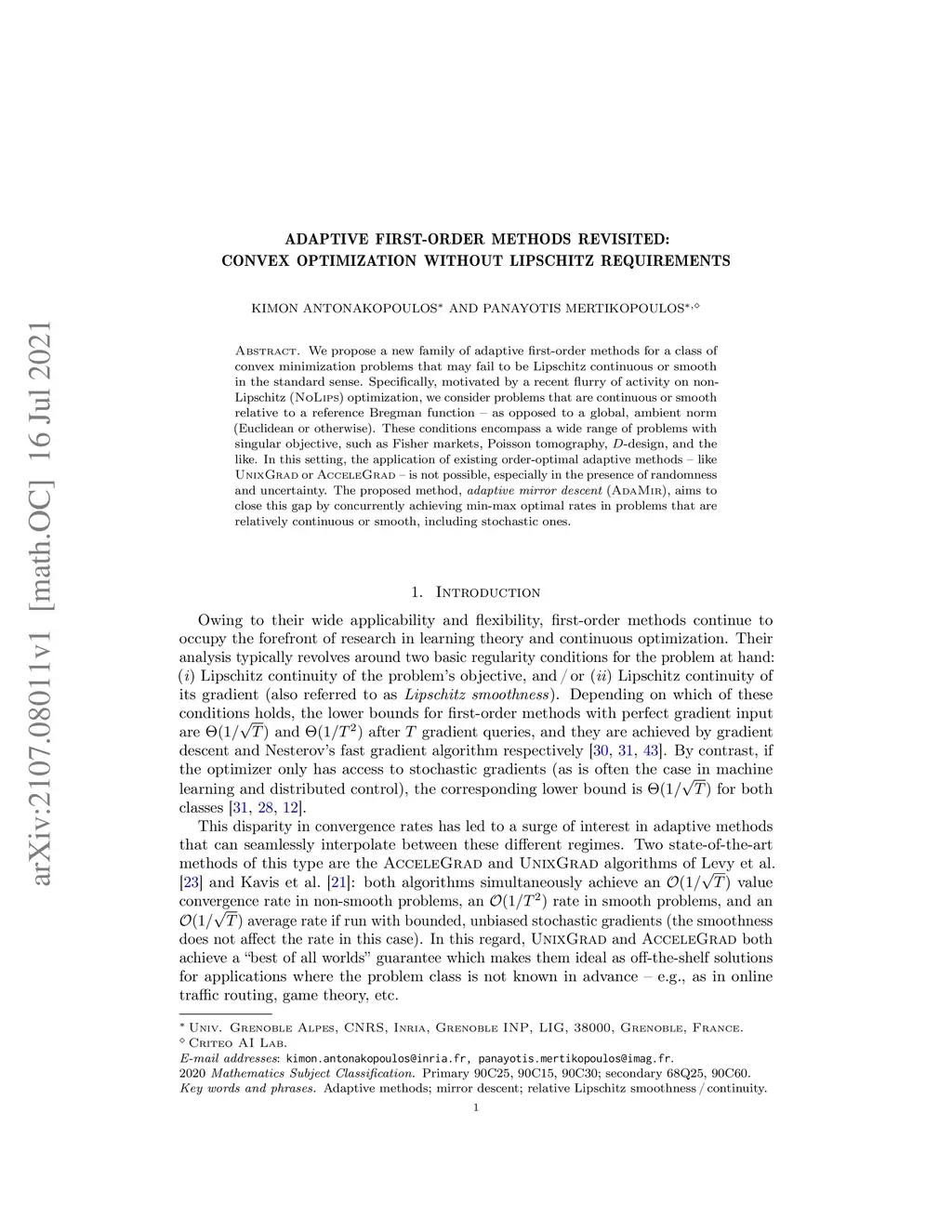 We propose a new family of adaptive first-order methods for a class of convex minimization problems that may fail to be Lipschitz continuous or smooth in the standard sense. Specifically, motivated by a recent flurry of activity on non-Lipschitz (NoLips) optimization, we consider problems that are continuous or smooth relative to a reference Bregman function - as opposed to a global, ambient norm (Euclidean or otherwise). These conditions encompass a wide range of problems with singular objectives, such as Fisher markets, Poisson tomography, D-design, and the like. In this setting, the application of existing order-optimal adaptive methods - like UnixGrad or AcceleGrad - is not possible, especially in the presence of randomness and uncertainty. The proposed method - which we call adaptive mirror descent (AdaMir) - aims to close this gap by concurrently achieving min-max optimal rates in problems that are relatively continuous or smooth, including stochastic ones.