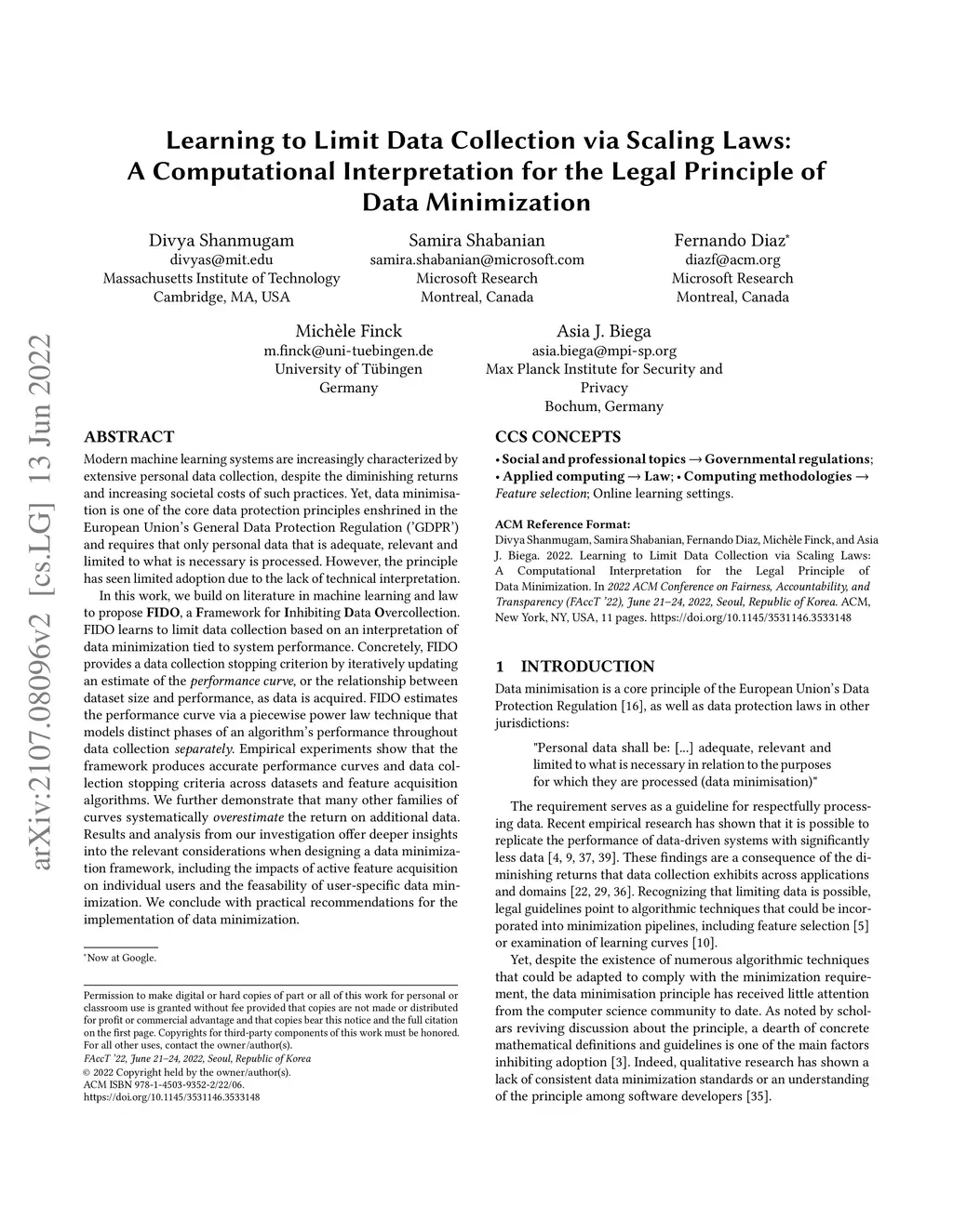 Modern machine learning systems are increasingly characterized by extensive personal data collection, despite the diminishing returns and increasing societal costs of such practices. Yet, data minimisation is one of the core data protection principles enshrined in the European Union's General Data Protection Regulation ('GDPR') and requires that only personal data that is adequate, relevant and limited to what is necessary is processed. However, the principle has seen limited adoption due to the lack of technical interpretation. In this work, we build on literature in machine learning and law to propose FIDO, a Framework for Inhibiting Data Overcollection. FIDO learns to limit data collection based on an interpretation of data minimization tied to system performance. Concretely, FIDO provides a data collection stopping criterion by iteratively updating an estimate of the performance curve, or the relationship between dataset size and performance, as data is acquired. FIDO estimates the performance curve via a piecewise power law technique that models distinct phases of an algorithm's performance throughout data collection separately. Empirical experiments show that the framework produces accurate performance curves and data collection stopping criteria across datasets and feature acquisition algorithms. We further demonstrate that many other families of curves systematically overestimate the return on additional data. Results and analysis from our investigation offer deeper insights into the relevant considerations when designing a data minimization framework, including the impacts of active feature acquisition on individual users and the feasability of user-specific data minimization. We conclude with practical recommendations for the implementation of data minimization.