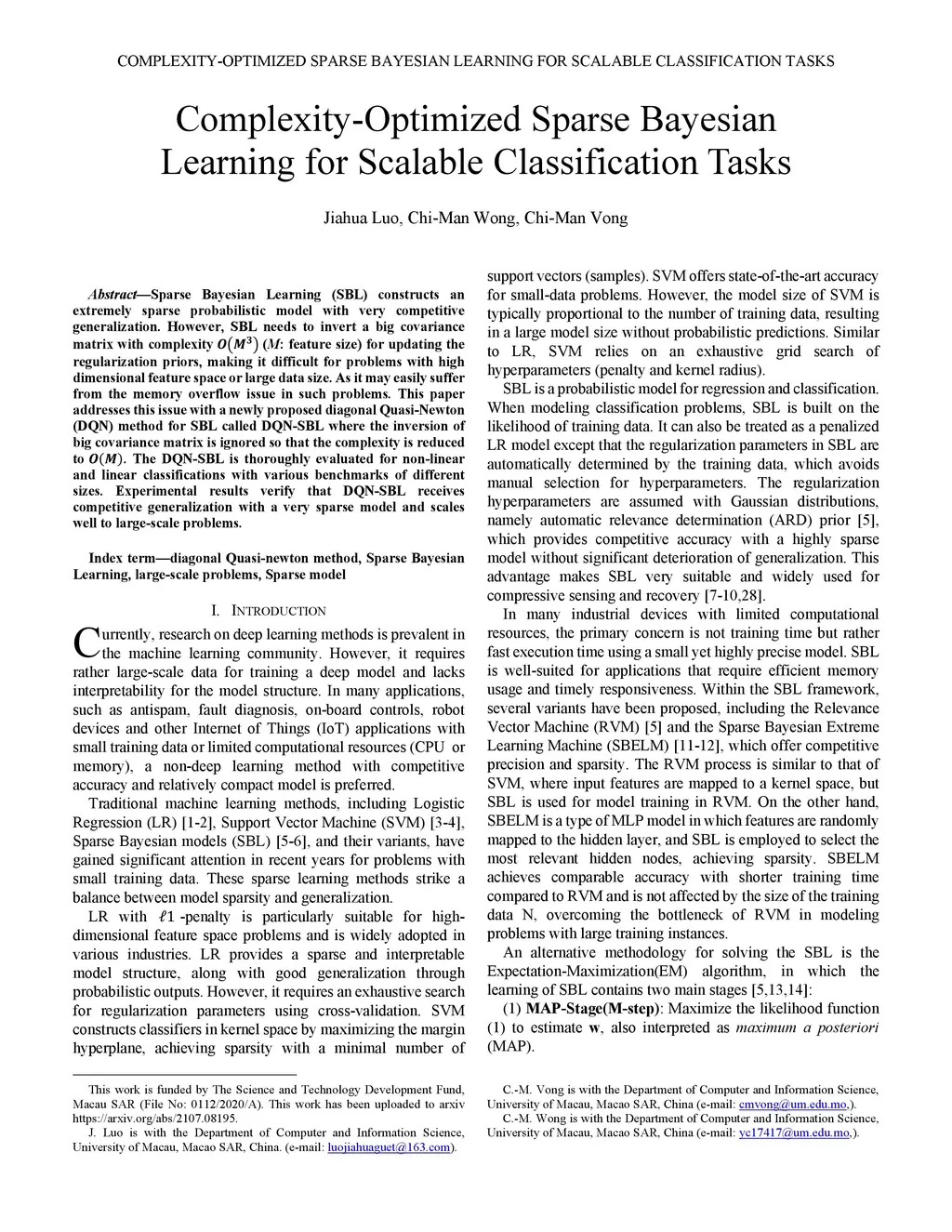 Sparse Bayesian Learning (SBL) constructs an extremely sparse probabilistic model with very competitive generalization. However, SBL needs to invert a big covariance matrix with complexity (M: feature size) for updating the regularization priors, making it difficult for problems with high dimensional feature space or large data size. As it may easily suffer from the memory overflow issue in such problems. This paper addresses this issue with a newly proposed diagonal Quasi-Newton (DQN) method for SBL called DQN-SBL where the inversion of big covariance matrix is ignored so that the complexity is reduced to . The DQN-SBL is thoroughly evaluated for non linear and linear classifications with various benchmarks of different sizes. Experimental results verify that DQN-SBL receives competitive generalization with a very sparse model and scales well to large-scale problems.