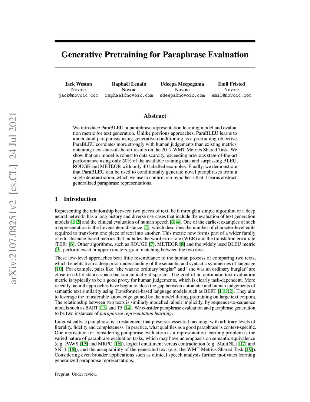 We introduce ParaBLEU, a paraphrase representation learning model and evaluation metric for text generation. Unlike previous approaches, ParaBLEU learns to understand paraphrasis using generative conditioning as a pretraining objective. ParaBLEU correlates more strongly with human judgements than existing metrics, obtaining new state-of-the-art results on the 2017 WMT Metrics Shared Task. We show that our model is robust to data scarcity, exceeding previous state-of-the-art performance using only of the available training data and surpassing BLEU, ROUGE and METEOR with only labelled examples. Finally, we demonstrate that ParaBLEU can be used to conditionally generate novel paraphrases from a single demonstration, which we use to confirm our hypothesis that it learns abstract, generalized paraphrase representations.