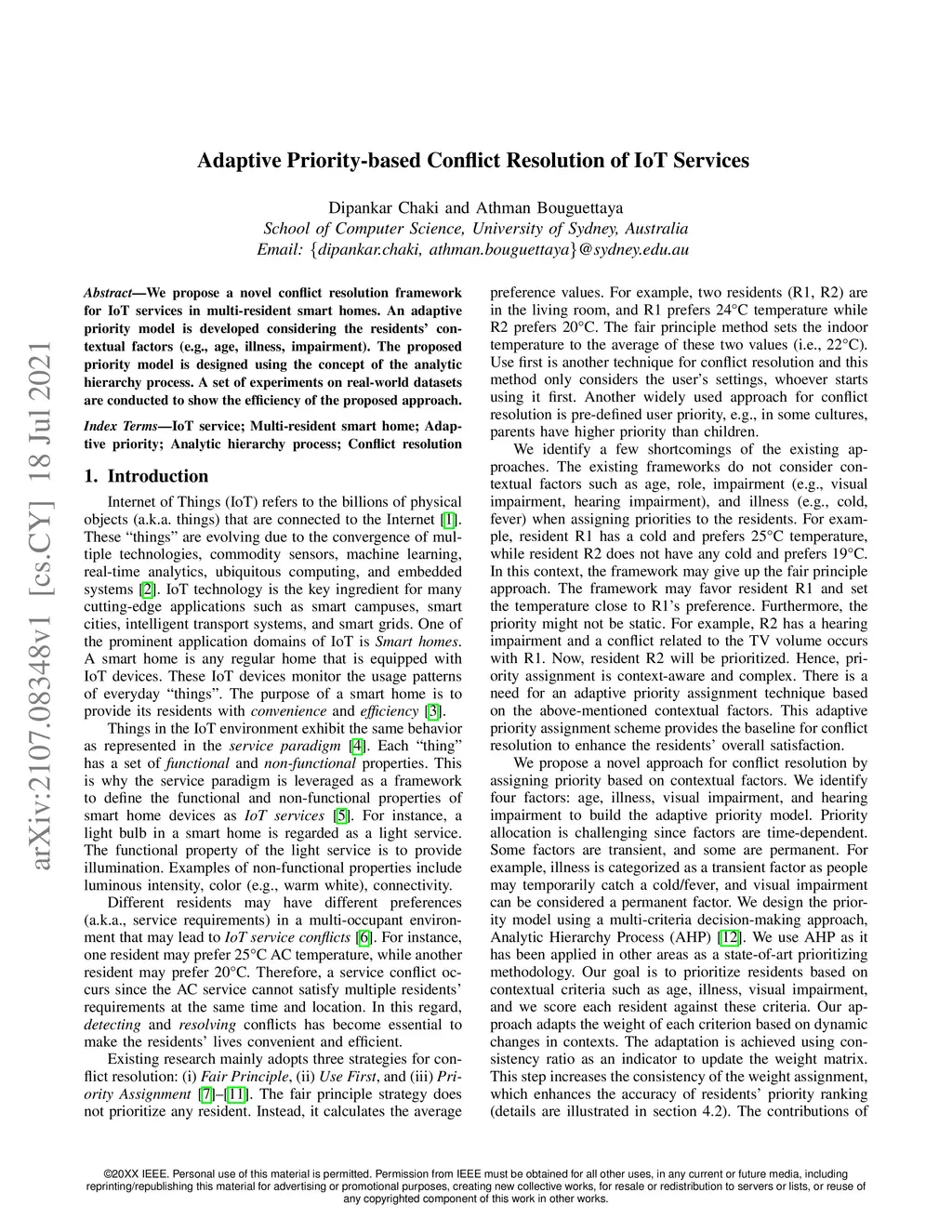 We propose a novel conflict resolution framework for IoT services in multi-resident smart homes. An adaptive priority model is developed considering the residents' contextual factors (e.g., age, illness, impairment). The proposed priority model is designed using the concept of the analytic hierarchy process. A set of experiments on real-world datasets are conducted to show the efficiency of the proposed approach.