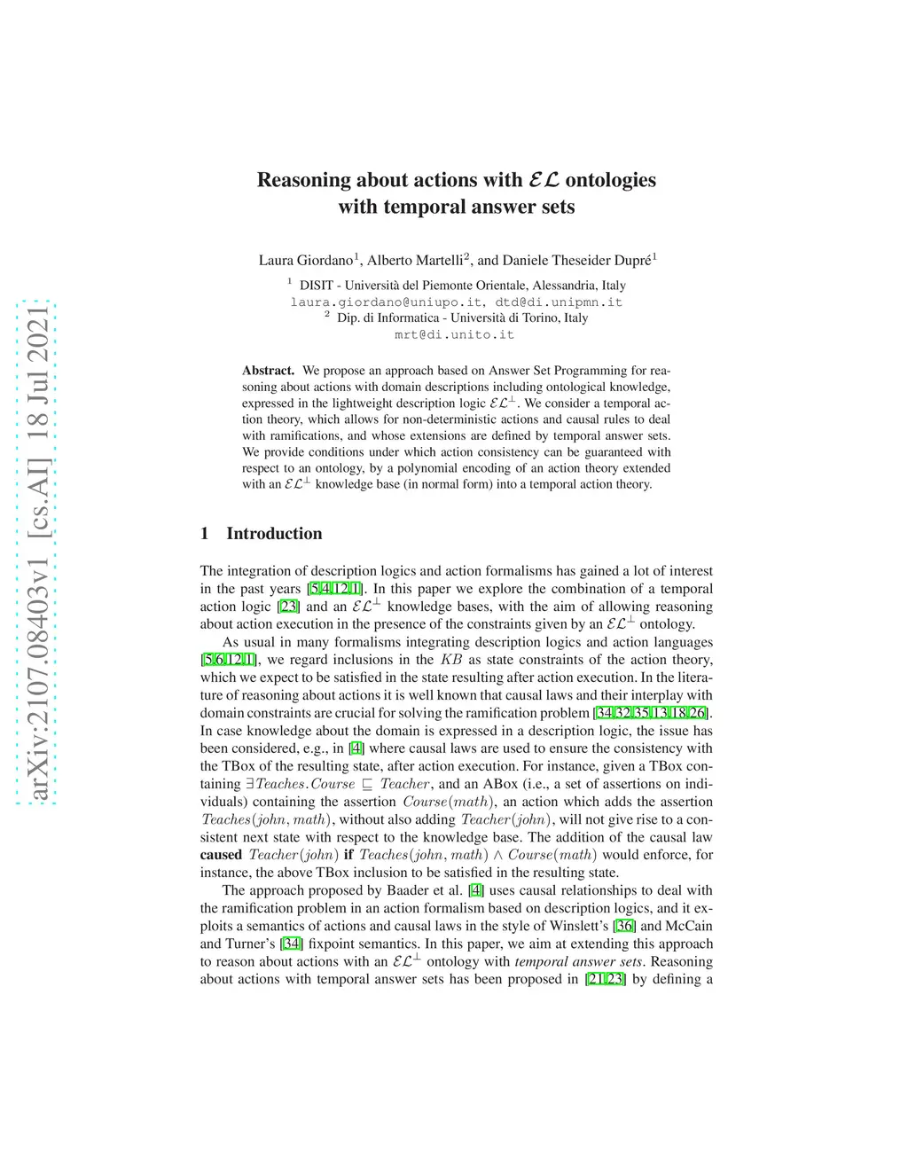 We propose an approach based on Answer Set Programming for reasoning about actions with domain descriptions including ontological knowledge, expressed in the lightweight description logic EL^\bot. We consider a temporal action theory, which allows for non-deterministic actions and causal rules to deal with ramifications, and whose extensions are defined by temporal answer sets. We provide conditions under which action consistency can be guaranteed with respect to an ontology, by a polynomial encoding of an action theory extended with an EL^\bot knowledge base (in normal form) into a temporal action theory.