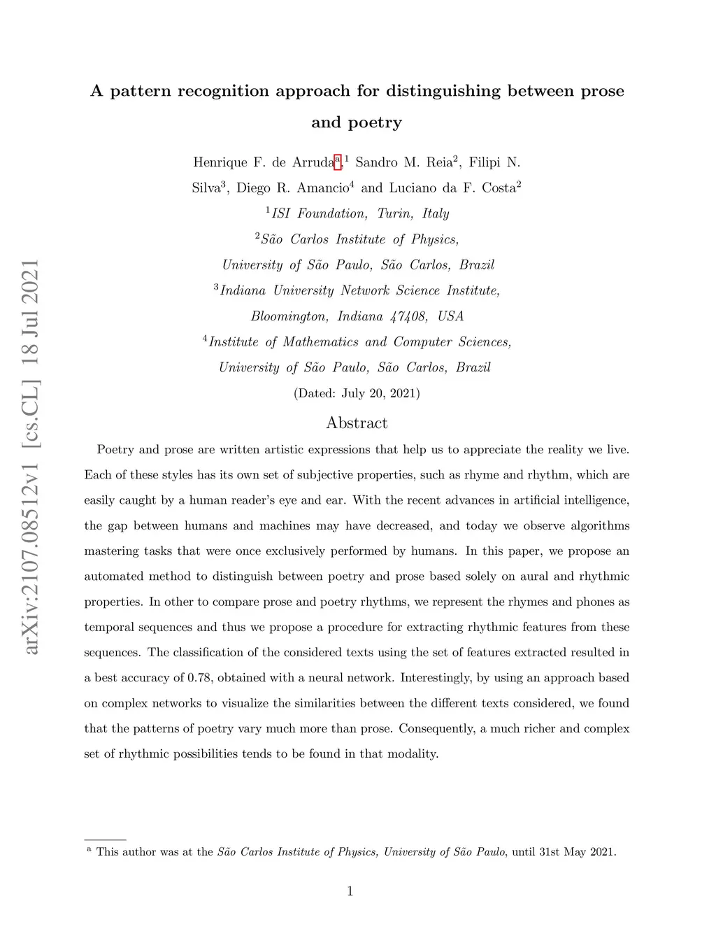 Poetry and prose are written artistic expressions that help us to appreciate the reality we live. Each of these styles has its own set of subjective properties, such as rhyme and rhythm, which are easily caught by a human reader's eye and ear. With the recent advances in artificial intelligence, the gap between humans and machines may have decreased, and today we observe algorithms mastering tasks that were once exclusively performed by humans. In this paper, we propose an automated method to distinguish between poetry and prose based solely on aural and rhythmic properties. In other to compare prose and poetry rhythms, we represent the rhymes and phones as temporal sequences and thus we propose a procedure for extracting rhythmic features from these sequences. The classification of the considered texts using the set of features extracted resulted in a best accuracy of 0.78, obtained with a neural network. Interestingly, by using an approach based on complex networks to visualize the similarities between the different texts considered, we found that the patterns of poetry vary much more than prose. Consequently, a much richer and complex set of rhythmic possibilities tends to be found in that modality.