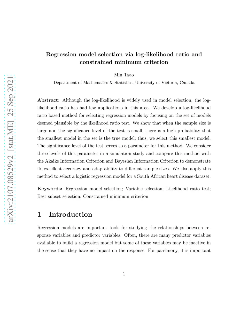 Although the log-likelihood is widely used in model selection, the log-likelihood ratio has had few applications in this area. We develop a log-likelihood ratio based method for selecting regression models by focusing on the set of models deemed plausible by the likelihood ratio test. We show that when the sample size is large and the significance level of the test is small, there is a high probability that the smallest model in the set is the true model; thus, we select this smallest model. The significance level of the test serves as a parameter for this method. We consider three levels of this parameter in a simulation study and compare this method with the Akaike Information Criterion and Bayesian Information Criterion to demonstrate its excellent accuracy and adaptability to different sample sizes. We also apply this method to select a logistic regression model for a South African heart disease dataset.