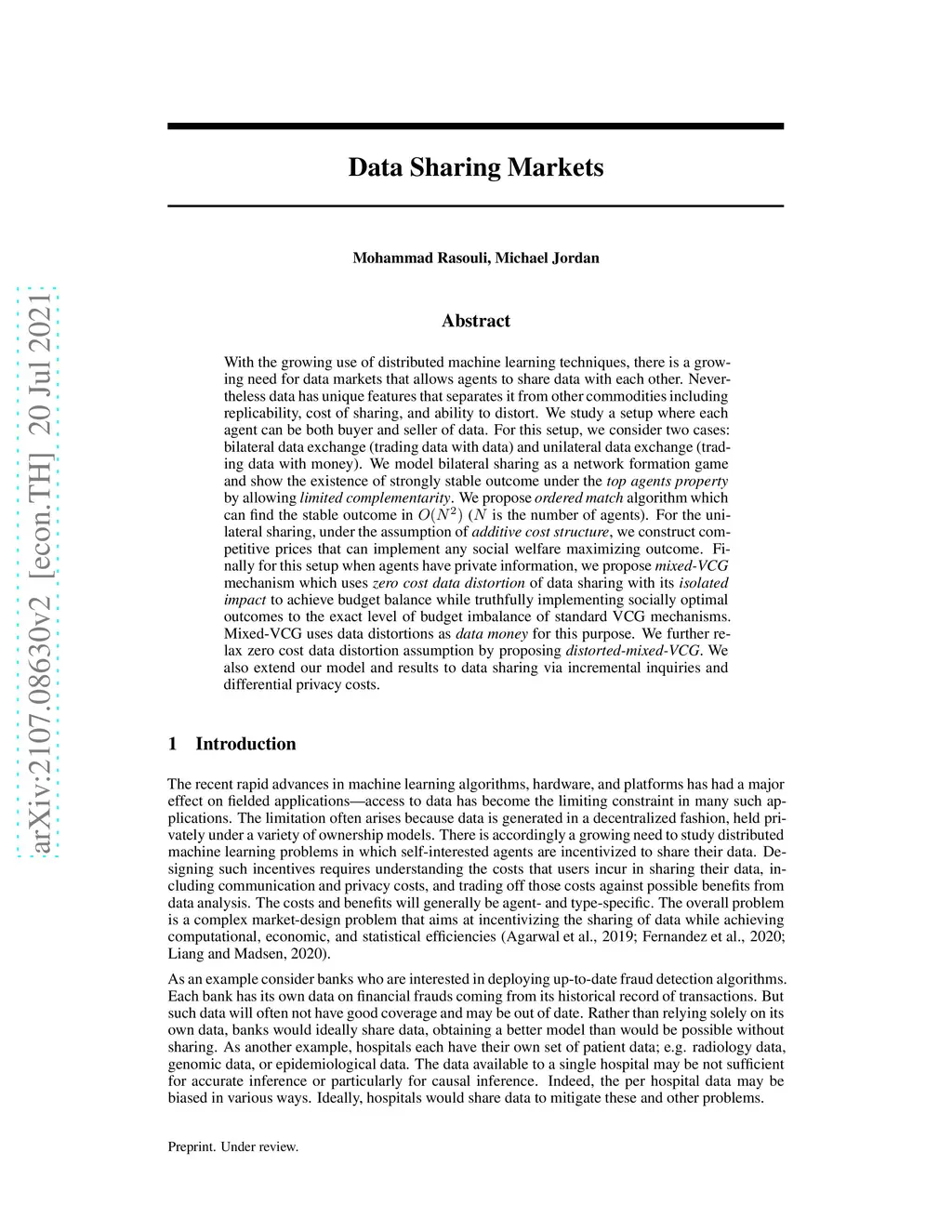 With the growing use of distributed machine learning techniques, there is a growing need for data markets that allows agents to share data with each other. Nevertheless data has unique features that separates it from other commodities including replicability, cost of sharing, and ability to distort. We study a setup where each agent can be both buyer and seller of data. For this setup, we consider two cases: bilateral data exchange (trading data with data) and unilateral data exchange (trading data with money). We model bilateral sharing as a network formation game and show the existence of strongly stable outcome under the top agents property by allowing limited complementarity. We propose ordered match algorithm which can find the stable outcome in O(N^2) (N is the number of agents). For the unilateral sharing, under the assumption of additive cost structure, we construct competitive prices that can implement any social welfare maximizing outcome. Finally for this setup when agents have private information, we propose mixed-VCG mechanism which uses zero cost data distortion of data sharing with its isolated impact to achieve budget balance while truthfully implementing socially optimal outcomes to the exact level of budget imbalance of standard VCG mechanisms. Mixed-VCG uses data distortions as data money for this purpose. We further relax zero cost data distortion assumption by proposing distorted-mixed-VCG. We also extend our model and results to data sharing via incremental inquiries and differential privacy costs.
