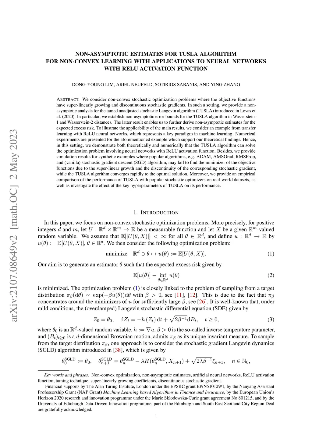 We consider non-convex stochastic optimization problems where the objective functions have super-linearly growing and discontinuous stochastic gradients. In such a setting, we provide a non-asymptotic analysis for the tamed unadjusted stochastic Langevin algorithm (TUSLA) introduced in Lovas et al. (2020). In particular, we establish non-asymptotic error bounds for the TUSLA algorithm in Wasserstein-1 and Wasserstein-2 distances. The latter result enables us to further derive non-asymptotic estimates for the expected excess risk. To illustrate the applicability of the main results, we consider an example from transfer learning with ReLU neural networks, which represents a key paradigm in machine learning. Numerical experiments are presented for the aforementioned example which support our theoretical findings. Hence, in this setting, we demonstrate both theoretically and numerically that the TUSLA algorithm can solve the optimization problem involving neural networks with ReLU activation function. Besides, we provide simulation results for synthetic examples where popular algorithms, e.g. ADAM, AMSGrad, RMSProp, and (vanilla) stochastic gradient descent (SGD) algorithm, may fail to find the minimizer of the objective functions due to the super-linear growth and the discontinuity of the corresponding stochastic gradient, while the TUSLA algorithm converges rapidly to the optimal solution. Moreover, we provide an empirical comparison of the performance of TUSLA with popular stochastic optimizers on real-world datasets, as well as investigate the effect of the key hyperparameters of TUSLA on its performance.