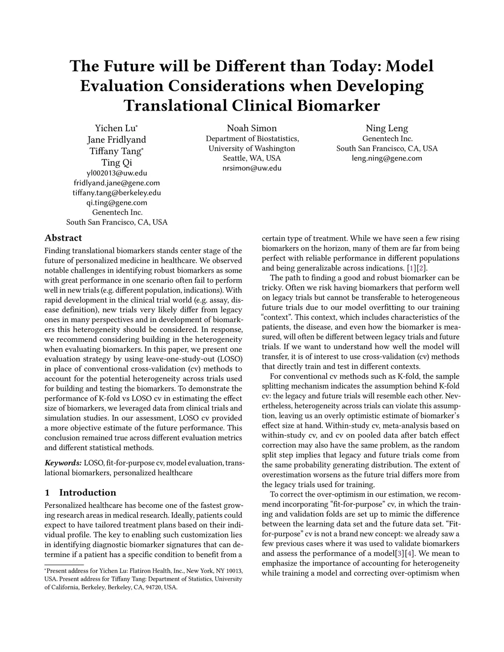 Finding translational biomarkers stands center stage of the future of personalized medicine in healthcare. We observed notable challenges in identifying robust biomarkers as some with great performance in one scenario often fail to perform well in new trials (e.g. different population, indications). With rapid development in the clinical trial world (e.g. assay, disease definition), new trials very likely differ from legacy ones in many perspectives and in development of biomarkers this heterogeneity should be considered. In response, we recommend considering building in the heterogeneity when evaluating biomarkers. In this paper, we present one evaluation strategy by using leave-one-study-out (LOSO) in place of conventional cross-validation (cv) methods to account for the potential heterogeneity across trials used for building and testing the biomarkers. To demonstrate the performance of K-fold vs LOSO cv in estimating the effect size of biomarkers, we leveraged data from clinical trials and simulation studies. In our assessment, LOSO cv provided a more objective estimate of the future performance. This conclusion remained true across different evaluation metrics and different statistical methods.