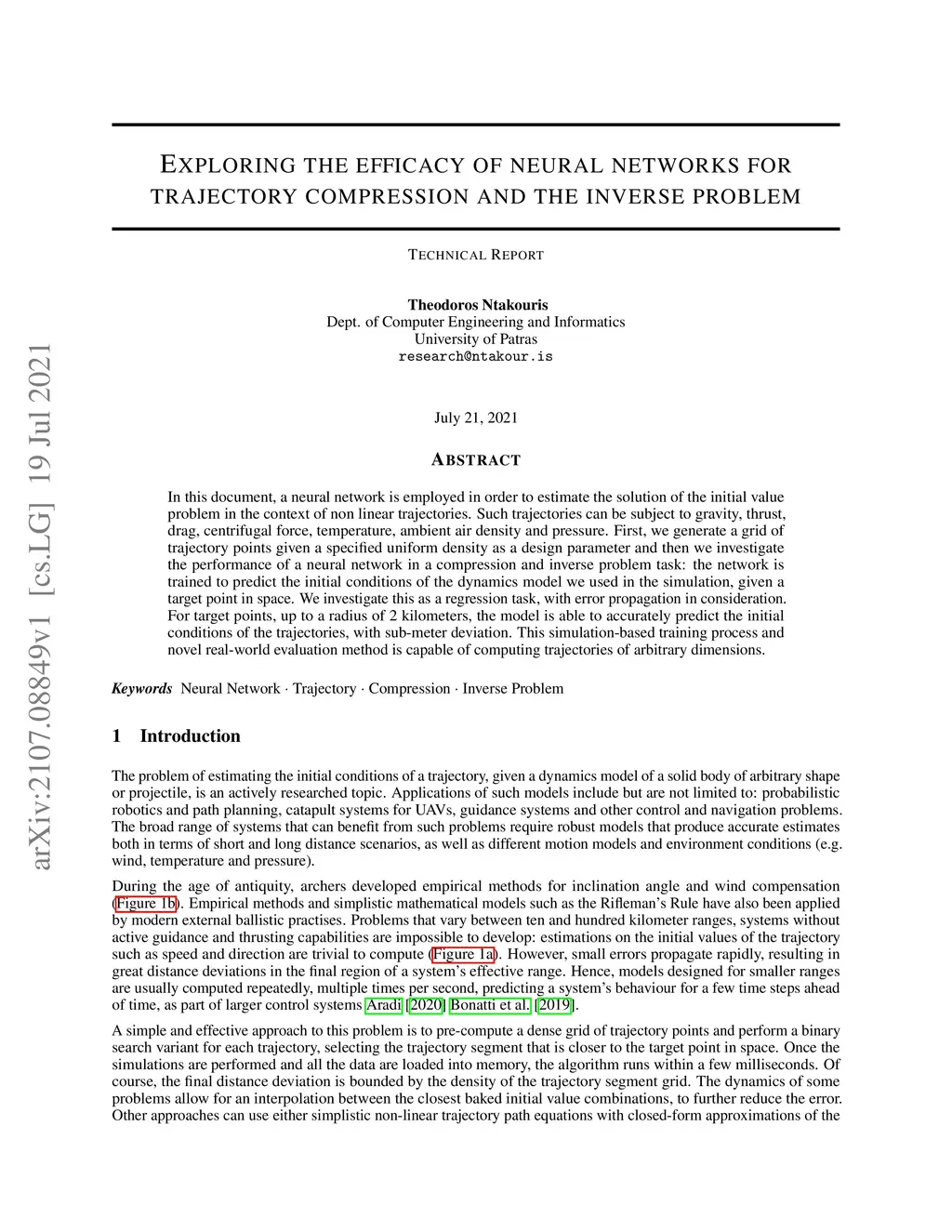 In this document, a neural network is employed in order to estimate the solution of the initial value problem in the context of non linear trajectories. Such trajectories can be subject to gravity, thrust, drag, centrifugal force, temperature, ambient air density and pressure. First, we generate a grid of trajectory points given a specified uniform density as a design parameter and then we investigate the performance of a neural network in a compression and inverse problem task: the network is trained to predict the initial conditions of the dynamics model we used in the simulation, given a target point in space. We investigate this as a regression task, with error propagation in consideration. For target points, up to a radius of 2 kilometers, the model is able to accurately predict the initial conditions of the trajectories, with sub-meter deviation. This simulation-based training process and novel real-world evaluation method is capable of computing trajectories of arbitrary dimensions.